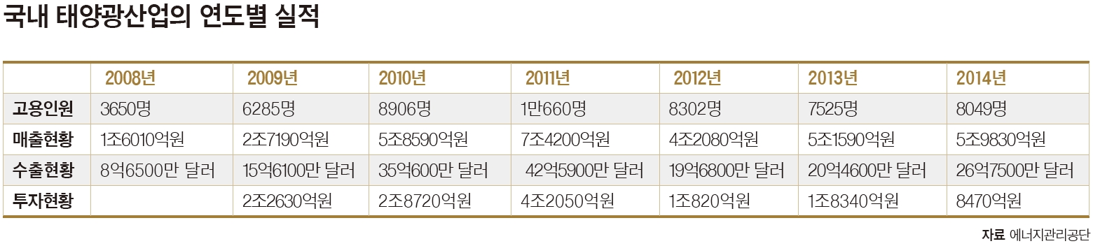 2008년 글로벌 금융위기는 글로벌 태양광 시장에 큰 영향을 줬다. 그동안 태양광 업체들은 정부의 보조금으로 사업을 확대했다고 보면 된다. 금융위기가 터지면서 미국과 유럽 등에서 정부 보조금이 깎이거나 삭감됐다. 당연히 기업들은 큰 타격을 입었다. 엎친 데 덮친 격으로 태양광 부품은 공급과잉 상황이었다. 태양광 산업의 핵심 기초소재로 꼽히는 폴리실리콘이 대표적 사례다. 2011년 6월, 폴리실리콘 1kg의 가격은 54달러였다. 같은 해 12월 폴리실리콘 가격은 29.9달러로 폭락했다. 2012년 12월에는 15.5달러까지 내려갔다. 올해 5월에 들어서야 16달러로 조금 회복됐다. 잉곳, 셀 등의 부품가격도 폭락했다. 한국태양광산업협회 서재홍 부장이 “과거의 영광을 다시 경험하기는 힘들 듯 하다”고 토로할 정도다.