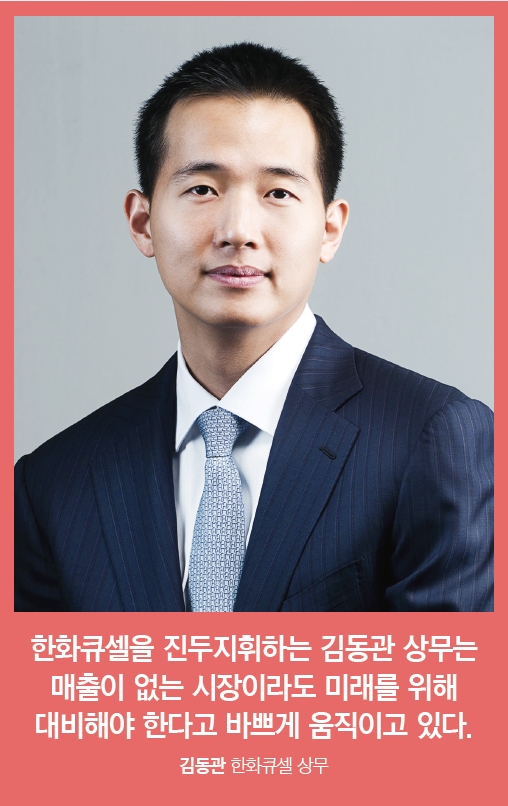 하버드대학 정치학과를 졸업한 김동관 상무는 2010년 1월 한화 회장실 차장으로 입사했다. 2011년 12월 한화솔라원으로 근무지를 옮기면서 태양광 사업과 관계를 맺기 시작했다. 2013년 8월, 2012년 독일 태양광 기업 큐셀을 인수해 만든 한화큐셀 전략마케팅 실장으로 옮겼다. 김 상무는 적자투성이의 한화큐셀을 1년 만에 흑자로 돌려놓으면서 재계의 눈길을 끌기 시작했다. 2014년 9월 한화솔라원으로 복귀한 후에는 그해 12월 발표된 한화솔라원과 한화큐셀의 합병 작업에 중요한 역할을 한 것으로 알려졌다. 한화솔라원과 한화큐셀의 합병으로 한화큐셀의 태양광 셀 생산 규모는 3.28GW에 이르러 세계 1위의 태양광 셀 기업으로 탈바꿈하게 됐다.