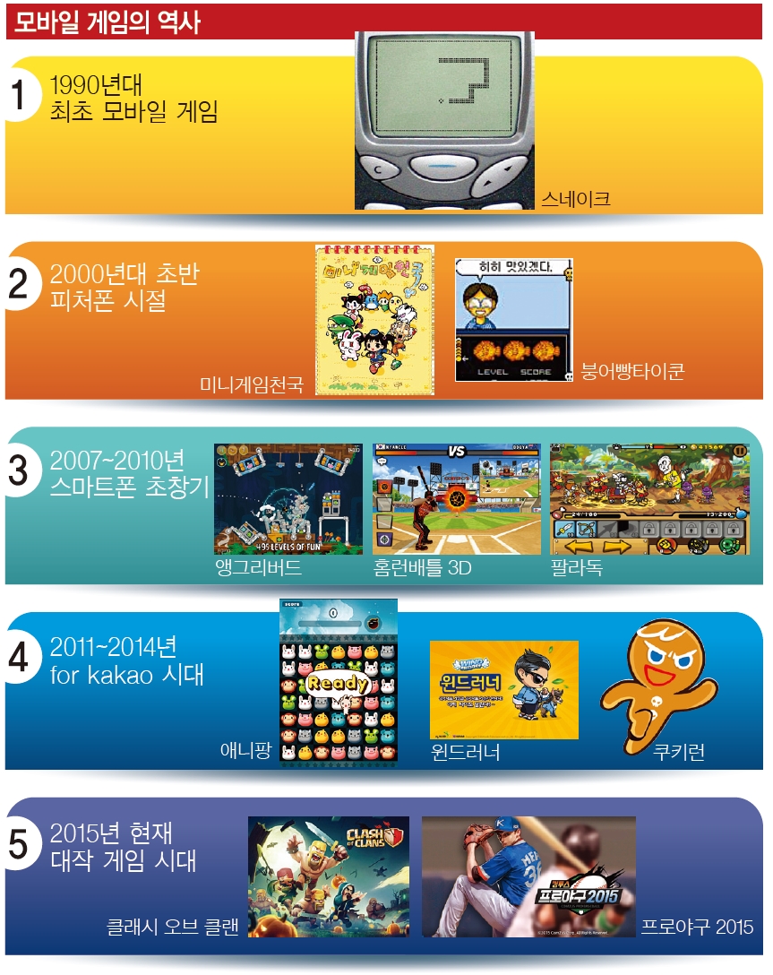 국내에서는 1999년 게임개발사 컴투스가 개발한 ‘게임 5종’을 국내 최초의 모바일 게임으로 꼽는다. 당시 유행했던 다마고치와 심리테스트 퀴즈 등 5가지 게임을 모아 LG텔레콤을 통해 제공한 것. 모바일 기기의 성능이 워낙 떨어지던 시절이어서 기술적으로 뛰어난 게임은 아니었다. 상업적으로도 흥행하지는 못했다. 실제 이 게임을 해봤다고 말하는 이는 드물다. 심지어 개발사인 컴투스조차도 당시의 게임 자료와 이미지를 갖고 있지 않다고 한다.