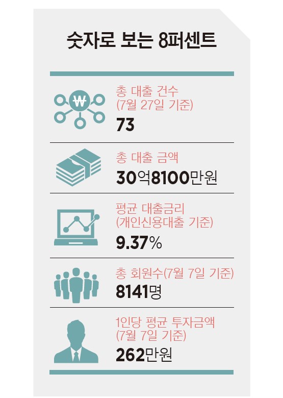 P2P 대출은 온라인 플랫폼을 이용해 대출자와 투자자가 만나는 시스템이다. 8퍼센트는 플랫폼 대출자와 투자자가 만나는 플랫폼 역할을 한다. 대출자와 투자자를 연결해주고 받는 수수료가 수익 모델이다. 아직까지 서비스 확대를 위해 수수료는 받지 않고 있다. 매주 수요일과 금요일 8퍼센트 홈페이지에 올라오는 ‘이 주의 상품’을 보면 P2P 서비스를 좀더 쉽게 이해할 수 있다. 대출자와 대출금액, 이 상품에 투자했을 때 얻을 수 있는 예상 수익률과 만기, 대출자의 신용등급, 대출목적, 모집금액 등이 공개된다. 이 상품을 보고 투자 여부를 결정하면 된다. 대출자가 원하는 금액이 모이면 대출이 이뤄진다. 이 대표는 “P2P 대출이 새로운 방식은 아니다. 한국의 전통적인 계와 비슷하다”고 설명했다. 7월 말 현재 73건의 대출이 이뤄졌는데, 부도율은 0%다. 평균 대출금리(개인+법인)는 연 6.65%다. 현재 8퍼센트는 수수료를 받지 않기 때문에, 이 금리는 고스란히 투자자의 평균 수익률이 된다. 기존 금융권에서 개인이 기대하기 어려운 수익이다.