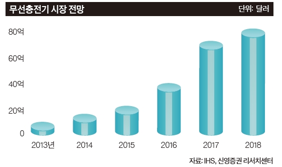 글로벌 시장조사업체인 IHS에 따르면 글로벌 무선 충전기 출하량은 지난해 5000만대에서 올해 1억2000대로 늘어날 전망이다. 2024년 20억대로 10년 만에 40배 수준의 성장이 예상된다. 금액 기준으로는 올해 2조원, 2024년 18조원으로 대폭 늘어날 전망이다. 김영각 현대증권 연구원은 “삼성전자에 이어 애플·샤오미·소니 등도 향후 무선 충전을 탑재한 스마트폰을 출시할 것으로 전망된다”고 예상했다. IT업계에서도 새로운 시장으로 부상할 것으로 보고 있다.