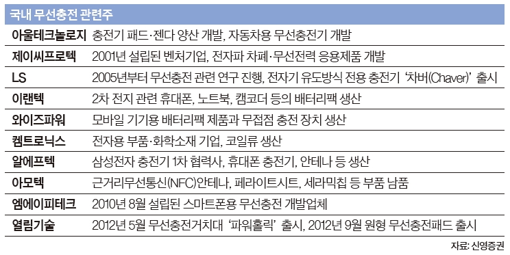 무선 충전 시장 확대에 따라 관련 기업들에 대한 관심도 커지고 있다. 국내에서는 LG이노텍·LS산전·한솔테크닉스·켐트로닉스·아모텍·동양이엔피·이랜텍·알에프텍·크로바하이텍 등의 수혜가 예상된다. 특히 무선 충전 모듈 업체 국내 1위 기업인 아모텍은 시장이 커지면서 가장 큰 수혜주로 꼽힌다. 아모텍은 올해 삼성전자가 출시한 스마트폰 갤럭시S6에 사용된 무선 충전 부품을 납품하고 있다. 아모텍 주가는 올 들어 9월 8일까지 21% 올랐다.
