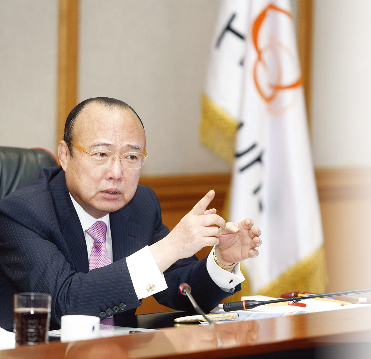 포브스코리아와 한국경영사학회가 공동으로 진행하는 특별기획 ‘한국 10대기업 핵심 DNA, 창업자들의 기업가정신을 찾아서’의 7번째 기업은 신용과 의리의 리더십으로 글로벌 경영을 선도하는 한화그룹이다. 특히 한화그룹 김종희 창업주와 김승연 회장의 기업가정신을 집중 조명했다. 김승연 한화그룹 회장은 탁월한 결단력을 보이는 승부사다. 김 회장이 서울 장교동 한화빌딩에서 열린 ‘경영전략회의’에 참석해 적극적인 투자를 주문하고 있다. / 중앙포토광복 70년인 올해 한화그룹은 특별히 ‘63’이라는 숫자와 인연이 깊었다. 우선 올해가 창사 63주년이다. 한화그룹은 1952년 현암 김종희 회장이 설립한 한국화약을 그 모태로 하고 있다. 김승연 회장도 기업 설립과 같은 1952년 생으로 올해 만 63세다. 그래서일까? 올 한해 한화그룹에는 어려움 속에서도 경사가 잇따랐다.