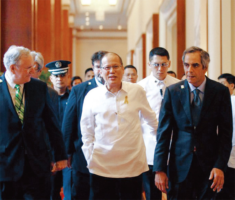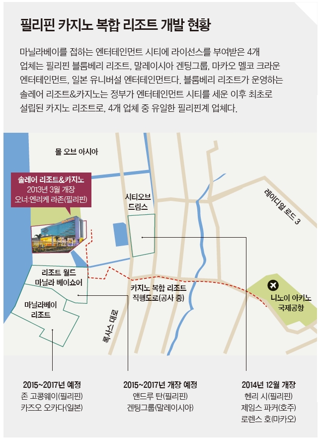 포브스 글로벌 CEO 콘퍼런스의 공동 협찬사인 라존 회장(오른쪽)이 지난 10월 14일 콘퍼런스 참석을 위해 솔레어 리조트를 찾은 베니그노 아키노 필리핀 대통령, 스티브 포브스 회장(왼쪽)과 회동하고 있다.2013년에 접어들자 필리핀 정부는 피라냐케 시와 마닐라베이 해안선을 따라 거대한 복합 리조트 타운인 엔터테인먼트 시티(Entertainment City)를 본격적으로 조성하기 시작했다. 인천 영종도처럼 인근 바다를 매립해 120만㎡의 부지에 마카오처럼 카지노를 포함해 MICE 산업과 레저를 한데 묶을 수 있는 대규모 복합 리조트를 도시 규모로 개발한다는 취지였다. 여기에는 국영기관인 파코(PAGCOR, The Philippine Amusement and Gaming Corporation)로부터 게임 라이선스를 취득한 복합 리조트 4곳이 입주할 수 있었다. 필리핀 정부는 마닐라 니노이 아키노국제공항(NAIA)을 중심으로 공항에서 리조트까지 10분 안에 도달할 수 있는 직행 도로까지 계획했다. 마카오는 39%인 반면, 엔터테인먼트 시티는 15~27%로 비교적 낮은 세금률 역시 큰 장점이었다.