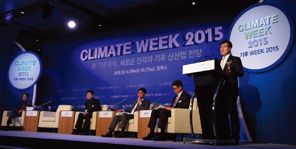 산업통상자원부와 한국에너지공단이 지난 10월 14일부터 서울 강남구 삼성동 인터컨티넨탈 서울 코엑스에서 주최한 ‘기후 위크 2015’ 국제 세미나엔 이틀 동안 정부와 산·학·연 전문가 500여 명이 참석하며 이 같은 위기감과 관심을 나타냈다. 그동안 ‘기후와 산업의 동행’ ‘산업계의 기후변화 대응과 성과’ ‘탄소가 돈이다’ 등의 주제로 진행돼 온 기후 위크의 올해 주제는 ‘새로운 전략과 기후 신산업 전망’이었다. 변종립 한국에너지공단 이사장은 “이제 온실가스 감축 의무를 이행하고 있는 산업계 기후변화 대응 실무자들이 신 기후체제를 대비한 기술과 정책 등 의미 있는 정보를 나누어야 할 때”라고 말했다.