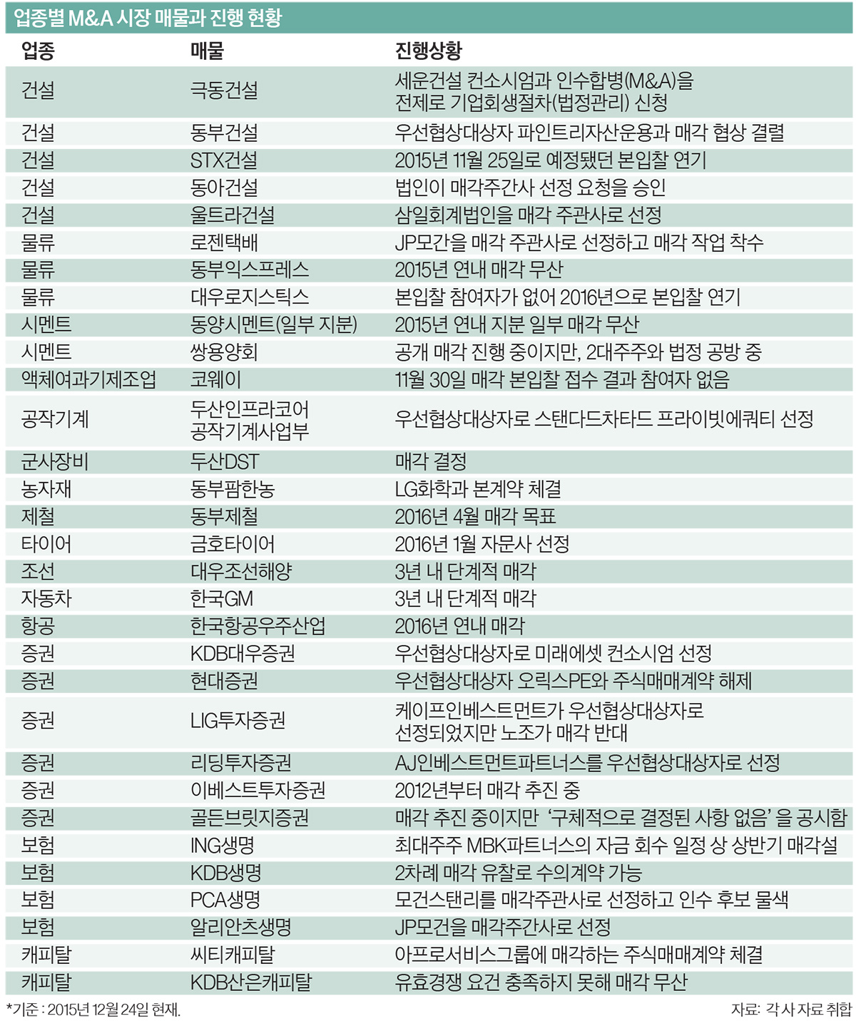2015년 연내 매각이 기대되던 동부건설도 매각이 결렬됐다. 법원이 2015년 10월 부실채권(NPL) 전문 운용사인 파인트리 자산운용을 우선협상대상자로 선정했지만, 본계약 체결을 위한 양해각서(MOU) 체결 시한이 세 차례나 연기된 끝에 결국 무산된 것이다. 동부건설이 투자한 동부익스프레스 매각이 무산된 상황이 영향을 미쳤다는 게 투자은행(IB) 관계자들의 설명이다.