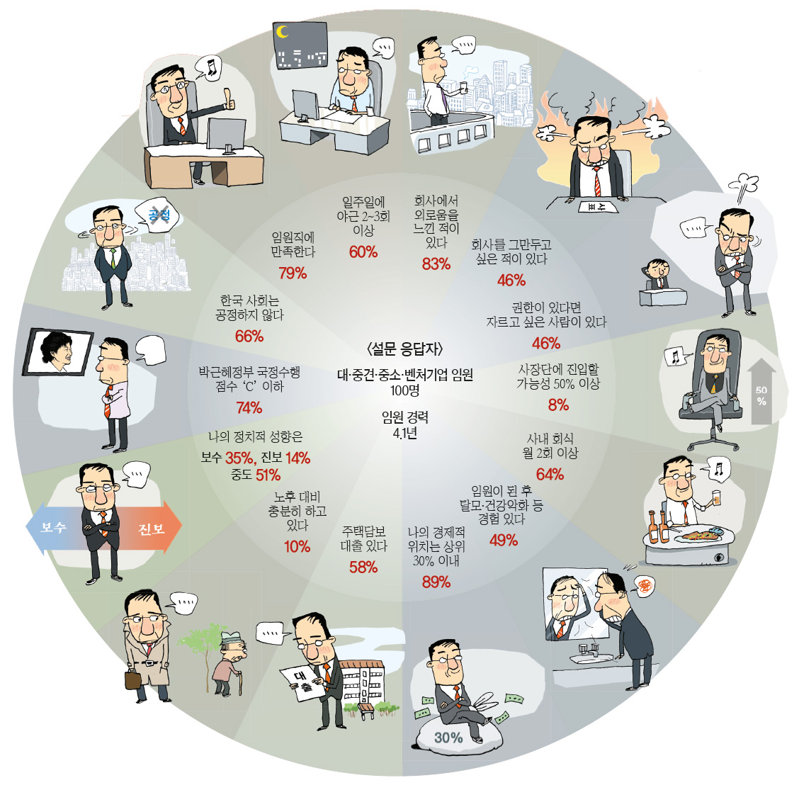 흔히 기업의 임원을 ‘별’이라고 부른다. 신입사원 눈에는 아득히 먼 별이다. 부장들에겐 닿을 듯 말 듯 애타는 별이다. 어느 드라마의 표현처럼 그들은 ‘두 발을 단단히 땅에 디디면서도 하늘을 보는 거인(巨人)’일지 모른다. 100대의 1의 경쟁에서 살아남아야 오를 수 있는 자리. 대한민국 김 상무와 이 전무도 자신을 별 또는 거인으로 여길까. 대·중견·중소·벤처기업 임원 100명에게 ‘임원으로 산다는 것’이 무엇인지 물었다. 대한민국 임원의 평균 모습을 지닌 가상의 ‘김 상무’를 통해 그들의 열정과 애환을 들여다봤다. 일러스트:중앙포토대기업에 다니는 김 상무는 올해 51세다. 대학을 졸업하고 20년 전 입사한 그는 16년 만에 부장을 달았고, 4년 전 ‘기업의 별’이라는 임원(상무)에 올랐다. 그야말로 치열한 경쟁에서 살아남았다(※한국경영자총협회에 따르면 신입사원이 1000명 입사하는 경우 24명이 부장으로 승진하고 7.4명만이 임원으로 승진한다. 대기업에서 임원 승진 비율은 0.47%, 중소기업은 5.6%다). 그 사이 함께 입사한 동기는 대부분 회사를 떠났다. 임원으로 승진 못 한 동기는 최근 명예퇴직을 신청했다. 미안해 하는 김 상무에게 동기는 “별이 빛나려면 주변이 어두워야 하는 거지”라는 말을 남겼다.