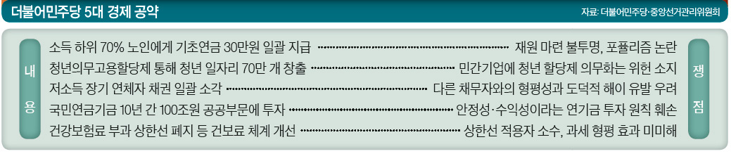 실제로 더민주당이 2월 5일 처음 발표한 민생복지 공약에는 기초연금 지급액이 30만원이 아닌 20만원이었다. 10만원 차이는 단순한 문제가 아니다. 수조원이 왔다 갔다 한다. 더민주당에 따르면 2016~2018년 단계적으로 기초연금을 인상해 지급하면 2018년 기준으로 18조7000억원의 재원이 필요하다. 현 제도를 유지할 때보다 6조4000억원이 더 든다. 이에 대해 김종인 대표는 “지난 대선 때도 무슨 돈으로 (기초연금 지급을)하느냐는 얘기가 있었지만 정치적 의지가 워낙 강하니까 시행하지 않았느냐”고 일축했다. 비판도 만만치 않다. 윤석명 한국 보건사회연구원은 “차등 없이 1.5배나 늘려서 주는 것은 미래 세대에 대한 고민이 없는 선거용 포퓰리즘”이라고 지적했다. 그는 “한국은 노인집단의 양극화가 전체 경제활동인구의 양극화보다 훨씬 심각하다”며 “기초연금을 가난한 노인에게 더 많이 몰아주는 것이 기초연금의 도입 취지에도 맞고 양극화 해소에도 도움이 된다”고 말했다.