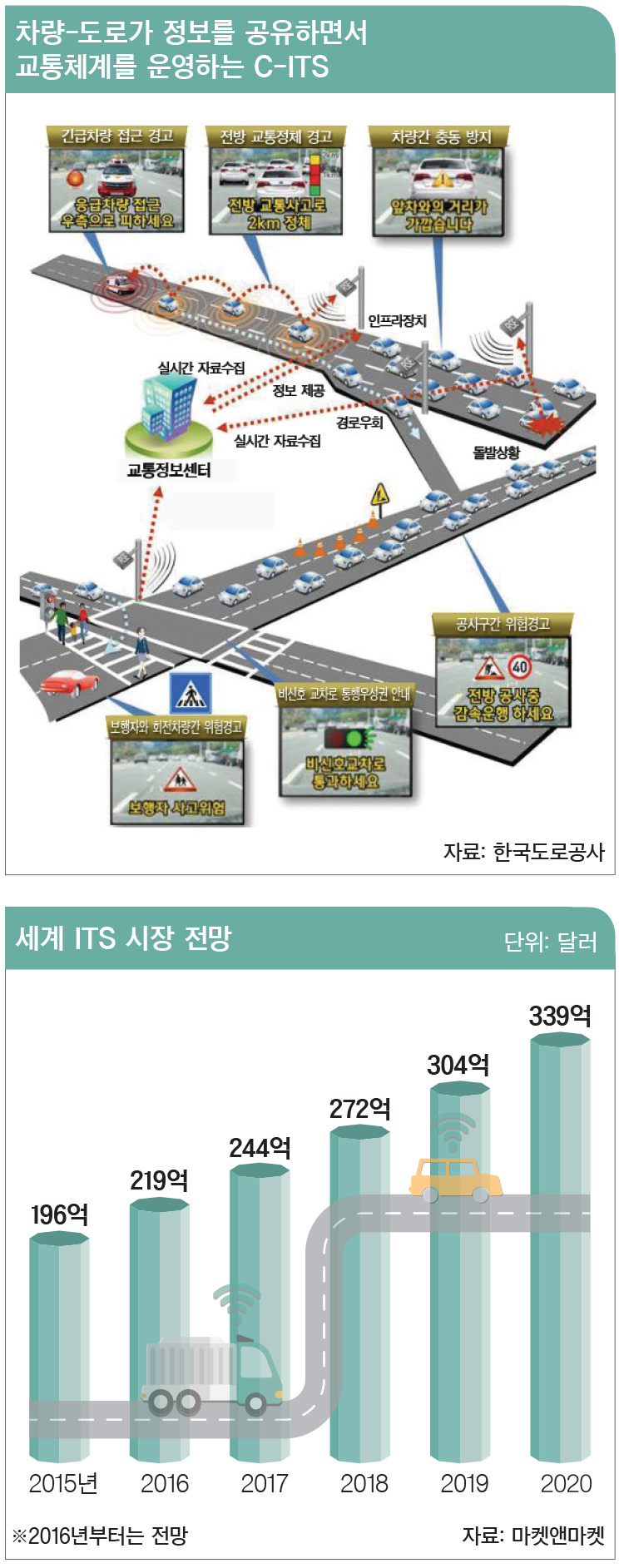 C-ITS에 대한 세계의 관심이 커지고 있다. 세계적인 경기 침체로 어느 나라나 재정 확보가 어렵다. 이에 따라 도로를 확장하거나 새로 까는 대신 효율적인 도로를 만드는 데 초점을 맞추기 시작한 것이다. 지능형교통시스템(ITS)은 교통수단이나 교통시설에 정보·통신·전자제어 등의 첨단기술을 접목해 교통 체계 운영과 관리의 효율성과 안정성을 향상시키는 기술을 말한다. 도로 전광판을 통해 전방의 지·정체 상황을 파악하거나 버스정류장에서 버스 도착정보를 확인하는 것, 고속도로에서 하이패스 단말기를 이용해 통행료를 지불하는 것 등이 모두 ITS의 예다.