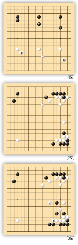 [3도]에서 앞의 바둑에서 흑1로 백의 진영에 들어갔다. 이 수는 백의 넓은 영토를 삭감하자는 수다. 이 수에 백은 받아주지 않고 백2로 위에서 덮어 씌워왔다. ‘모자씌움’이라고 불리는 행마다. 이것은 침입자인 흑1을 강하게 공격하겠다는 뜻이다. 그러자 흑3에 한 칸 뛰어 움직인다. 백4에 밀고 흑5에 뻗는다. 그다음 백6으로 흑돌의 사이를 들여다본다. 흑돌을 끊어 공격하겠다는 매서운 수다. 이후 이 바둑은 상상을 초월하는 난전이 벌어져 보는 이의 손에 땀을 쥐게 한다. 이 대마싸움이 얼마나 재미있는가는 바둑팬이라면 잘 알 것이다.