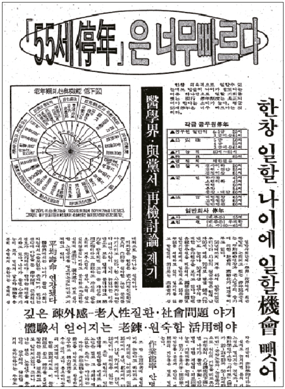 니혼게이자이신문을 보면 1975년 6월 2일자로 일본 노동성의 ‘임금구조기본통계조사’ 결과와 1976년 4월 26일 사설 ‘고령 사회의 대응을 서둘러야 하며, 노동자가 능력을 개발하고 실력을 발휘할 수 있는 기회를 늘리자’라는 주장의 기사가 눈에 들어온다. 60년대 말~70년대 초 언론과 연구기관 등을 중심으로 고령화 경고가 제기됐고, 70년대 초중반부터 정부의 대응이 본격적으로 시작된 셈이다.