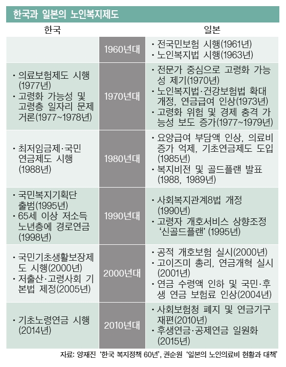 한국 정부의 대응은 일본에 비해선 현저히 늦다. 한국과 일본의 인구구조 변화는 10~15년, 제도 도입은 15~20년가량 뒤진다. 한국에 노인복지법이 제정, 공포된 것은 1981년. 1982년이 돼서야 경로헌장이 선포됐다. 60년대부터 노인복지법을 시행한 일본과는 약 20년의 차이가 있다. 국민연금은 일본이 1961년 도입한 데 비해 한국은 1988년에 시행했다. 1998년 노령수당제도 폐지 및 경로연금 신설, 2000년 저소득층 노인으로 경로연금 확대 등 고령화 대책을 실시했다. 그러나 2008년 기초노령 연금제도 및 노인장기보험 실시, 2013년 기초노령연금 갈등 고령화 정책 진행 양상은 일본과 비슷하게 흘러가고 있다.
