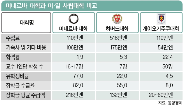 아직 일본은 7개국에 포함되지 않는다. 넬슨은 그 이유로 ‘비용 문제’를 꼽는다. 처음 1년 동안 생활하는 샌프란시스코는 미국 내에서도 단연 물가가 비싼 도시다. 그러니 2학년 이후로는 어느 정도 비용을 절약할 필요가 있다. 지리적·문화적 다양성을 확보하면서도 학생들에게 부담을 주지 않아야 한다는 게 미네르바의 원칙이다. 비용을 억제하려는 배경에는 미국의 고질적인 대학 등록금 문제가 있다. 수업료만 본다면 미네르바는 일본의 게이오기주쿠대과 비슷하다. 현재 미국 대부분의 대학에서는 등록금 인상 문제가 심각하다. 졸업과 함께 학자금 대출 상환 부담에 시달리는 학생이 끊이지 않는다. 넬슨은 “배움과 직결되지 않는 투자는 하지 않겠다”는 뜻을 분명히 한다. 일단 캠퍼스가 없으니 건설비나 청소·유지비가 들지 않는다. 미식축구 등 스포츠팀 육성도 하지 않는다. 호화로운 연구시설 역시 없다. 넬슨은 “교수진의 연구비를 어째서 학생이 내야 하는지 모르겠다”며 “학생이 내는 돈은 오로지 교수에게 가르침을 받는 용도로만 써야 한다”고 말했다.