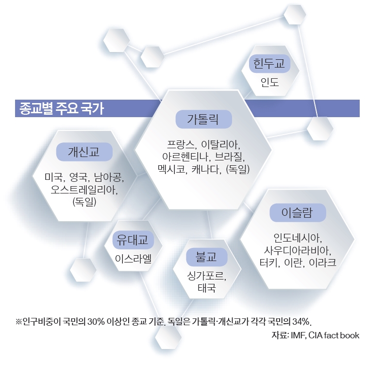 국제통화기금(IMF) 자료에 따르면 국내총생산(GDP)이 1000억 달러를 넘는 나라는 59개다(2016년 말 기준). 이 가운데 특정 종교를 국민의 30% 이상이 믿고 있는 곳은 48곳이다. 가톨릭 국가가 21개로 가장 많고 이어 이슬람(14), 개신교(9) 순이다. 불교는 2곳, 힌두교와 유대교가 각각 1곳이다. G20 국가 중에서는 가톨릭 국가가 6곳이고, 이어 개신교(4)·이슬람(3)·힌두교(1) 순이다. 불교와 유대교 국가는 없다.