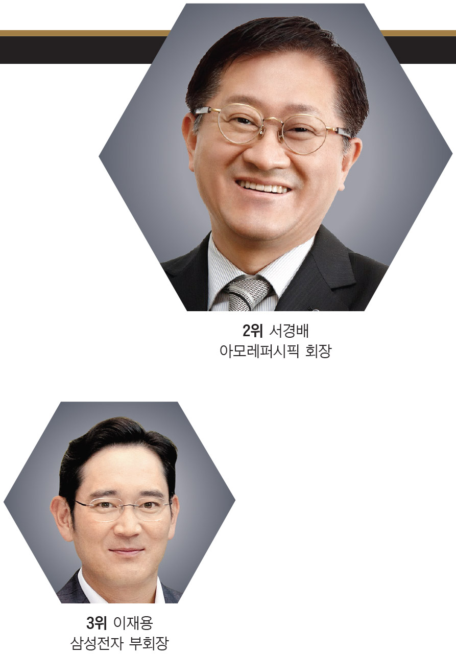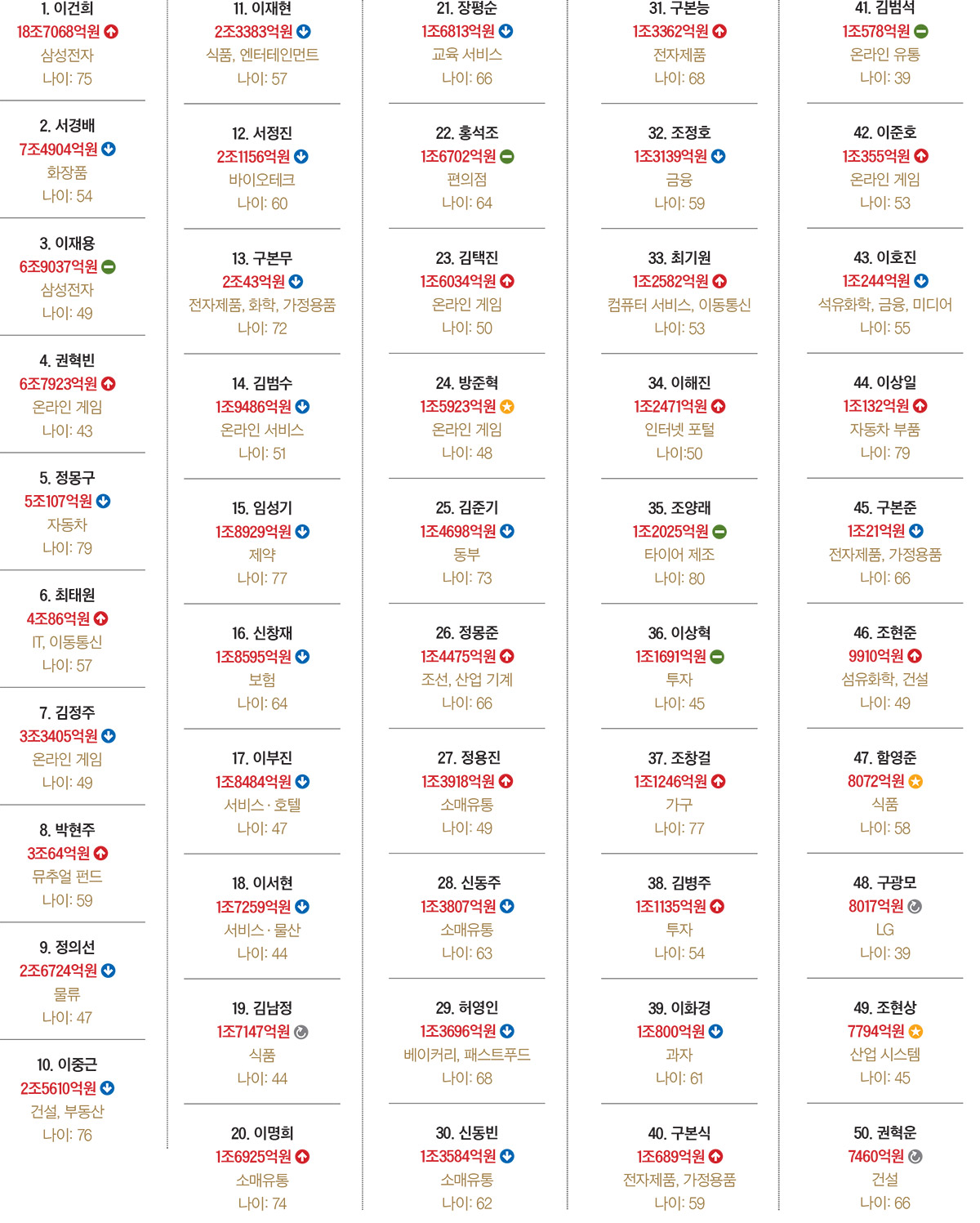 함영준 오뚜기 회장(47위)과 조현상 효성그룹 사장(49위)은 이번에 처음 순위에 들었다. 함 회장은 창업주 함태호 명예회장이 지난해 세상을 떠나며 지분을 상속받아 최대주주가 됐고, 조 사장은 효성 지분을 계속 사들이며 지분율 12.21%로 2대 주주가 됐다. 김남정 동원그룹 부회장(19위), 구광모 LG 상무(48위), 권혁운 아이에스동서 회장(50위)은 순위권에 재진입했다.