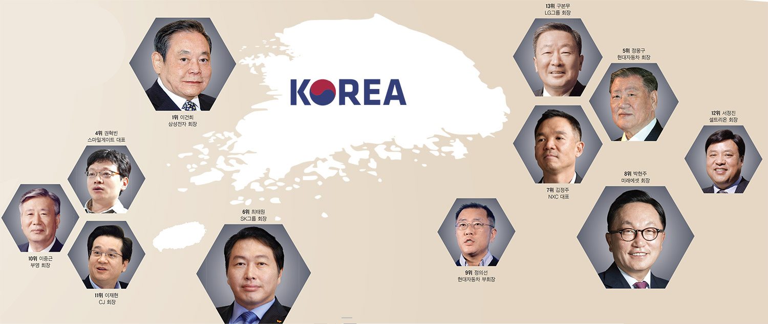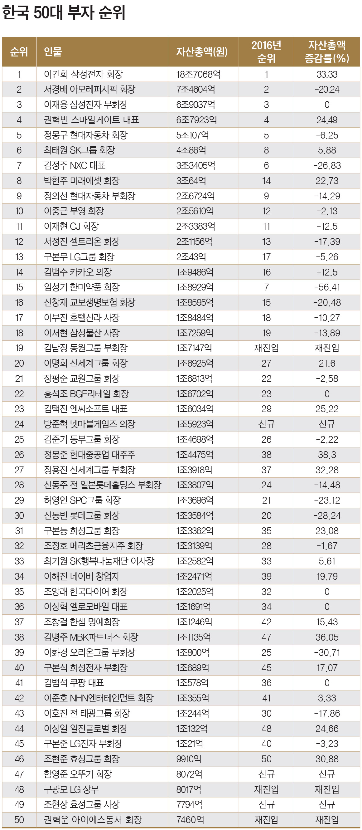 한국 최고 부자는 지난해에 이어 이건희 삼성전자 회장이 차지했다. 이 회장은 재산(홍라희 전 삼성미술관 리움 관장 재산 포함)이 지난해 14조4418억원에서 올해 18조7068억원으로 크게 늘면서 확고부동한 대한민국 최고 부자 자리를 지켰다. 2위 서경배 아모레퍼시픽 회장의 재산 7조4904억원의 배가 넘는다. 이재용 삼성전자 부회장, 권혁빈 스마일게이트 대표, 정몽구 현대자동차 회장이 각각 3~5위를 차지했다.