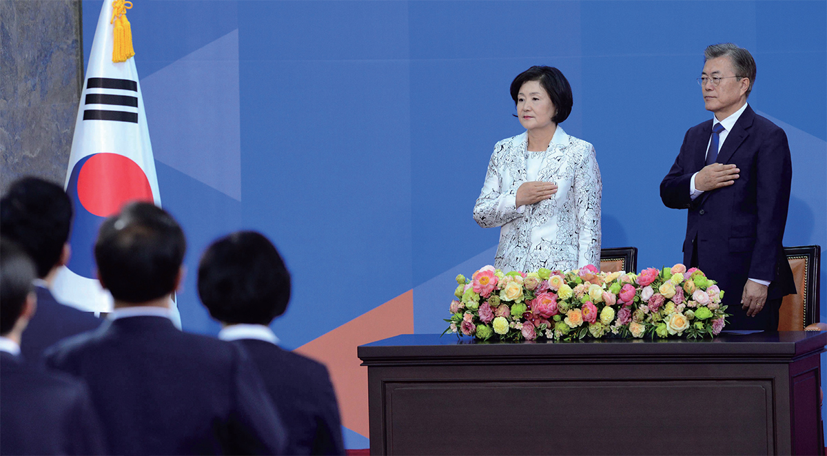 트럼프 정부가 북한 문제와 관련해 한국의 신임 정부가 미국과 보조를 맞추지 않을 가능성을 크게 우려하진 않는 듯 지난 5월 10일 문재인 대통령이 대통령 취임식에서 국기에 대한 경례를 하고 있다 / 사진 : NEWSIS지난 5월 9일 한국은 문재인 더불어민주당 후보를 새 대통령으로 선출했다. 문재인 신임 대통령은 진보적인 인권변호사 출신으로 북한 포용론을 지지한다. 탄핵된 뒤 뇌물 등의 혐의로 구속기소된 박근혜 전 대통령은 보수주의자였다. 그와 노선이 완전히 다른 문재인 신임 대통령이 취임하면서 도널드 트럼프 미국 대통령의 머리가 더 복잡해졌을지 모른다. 북한의 핵무기와 장거리 미사일 프로그램을 중단시키는 방법을 찾는 것이 그의 가장 시급한 외교정책 현안이기 때문이다.