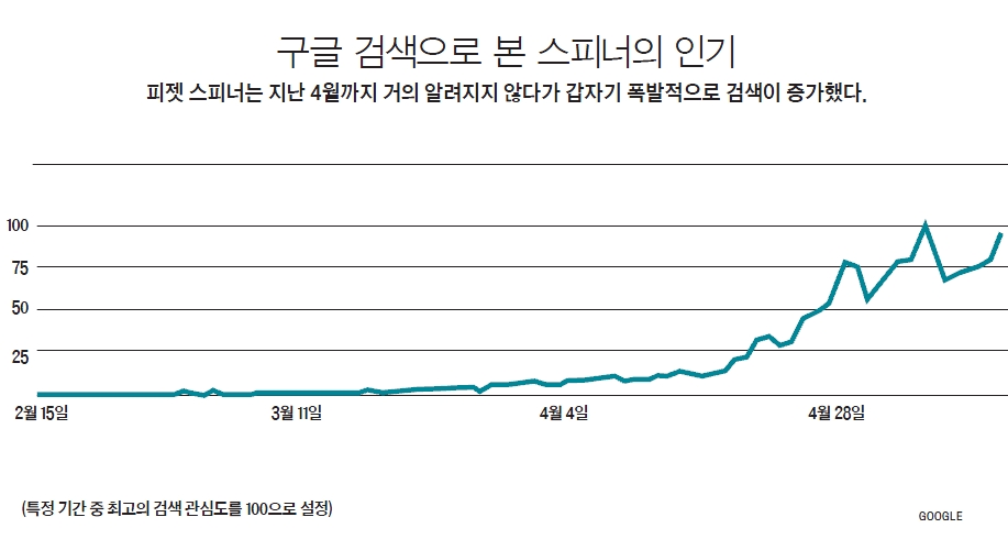 화학공학자 캐서린 헤팅거가 1990년대 초 발명했지만 피젯 스피너는 최근까지 인기를 끌지 못했다. 지난해 12월 경제전문지 포브스가 피젯 스피너를 ‘필수 소장(must-have)’ 오피스 완구라고 극찬한 뒤로 소셜뉴스 서비스 레딧, 유튜브 그리고 궁극적으로 초·중학생들의 호주머니 속으로 파고들었다. 말그대로 혜성처럼 떠올랐다. 구글 검색 트렌드가 이를 뒷받침한다.