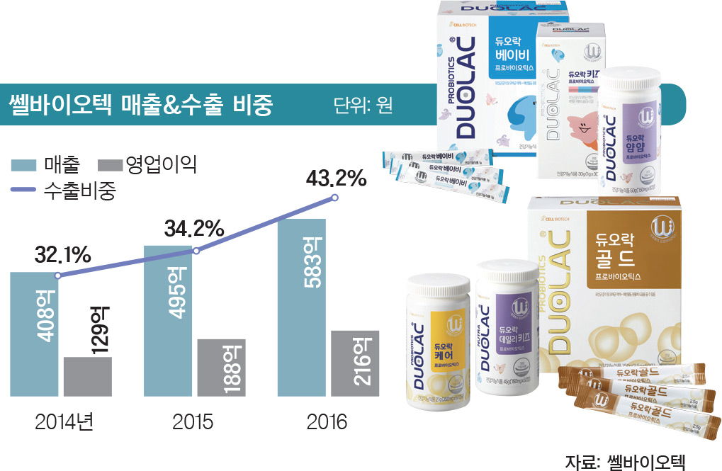 쎌바이오텍은 덴마크의 크리스찬한센·다니스코, 프랑스의 로셀, 일본 모리나와 함께 프로바이오틱스 시장에서 ‘다섯 손가락’에 드는 기업이다. 특히 유산균 종주국인 덴마크에서 자체브랜드 ‘듀오락’으로 1위 경쟁이 치열하다. 6월 7일 경기도 김포시 쎌바이오텍 본사에서 만난 정명준 대표는 “유럽의 경쟁회사들은 유산균 원료만 생산·공급하는데 반해 우리는 원료개발, 완제품 생산, 판매 등을 원스톱으로 처리할 수 있는 시스템을 갖춰 가격경쟁력이 있다”며 “5년 내에 유산균 기술을 적용한 대장암치료제를 개발해 바이오의약품 기업으로 거듭날 것”이라고 말했다. 듀오락은 현재 43개 국가에 수출하고 있다.