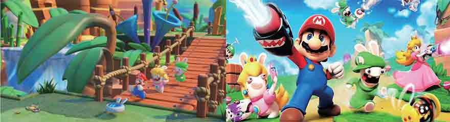공개된 트레일러 영상에서는 마리오 캐릭터들과 래비드들의 귀여운 모습을 확인할 수 있었다. 게임은 필드를 이동하다 만난 적들에 맞서 다양한 총기를 갖고 싸우는 방식을 채택했다. 전투가 시작되면 플레이어는 각 캐릭터를 이동시키고, 엄폐물을 이용해 적을 공격한다. 이 과정에서는 ‘슈퍼마리오’ 시리즈 특유의 점프와 협동 공격, 파이프 이동 등을 사용해 다양한 전략을 구사할 수 있다. 플레이어는 캐릭터와 무기의 특성에 따라 달라지는 공격 방식을 적절히 활용해서 게임을 진행해야 한다.