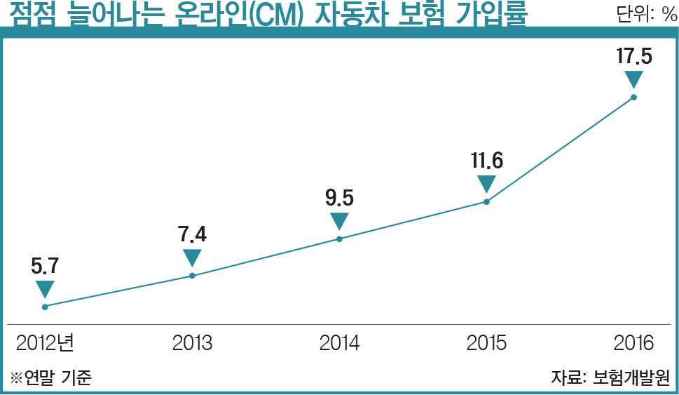 지난해 연말 기준으로 개인용 자동차 상품에 가입한 1524만대 중 266만대가 온라인(CM)을 통해 계약해 가입률은 17.5%를 차지했다. 2012년 온라인 가입률은 5.7%에 불과했으나 4년 만에 세 배 이상 커졌다. 대면 가입률은 2012년 61.9%에서 지난해 53.9%로 감소했다. 텔레마케팅(TM) 가입률 역시 2013년까지 꾸준히 늘었으나, 2014년 카드사 정보 유출 사태 이후 금융사의 개인정보 수집·보관·활용에 대해 엄격한 가이드라인이 마련돼 텔레마케팅 영업이 하락세로 변한 상황이다. 공진규 보험개발원 자동차보험통계팀장은 “인슈어테크의 대표라 할 수 있는 온라인 보험슈퍼마켓 보험다모아(www.e-insmarket.or.kr) 효과로 지난해 온라인 가입률이 큰 폭으로 늘었다”고 분석했다.