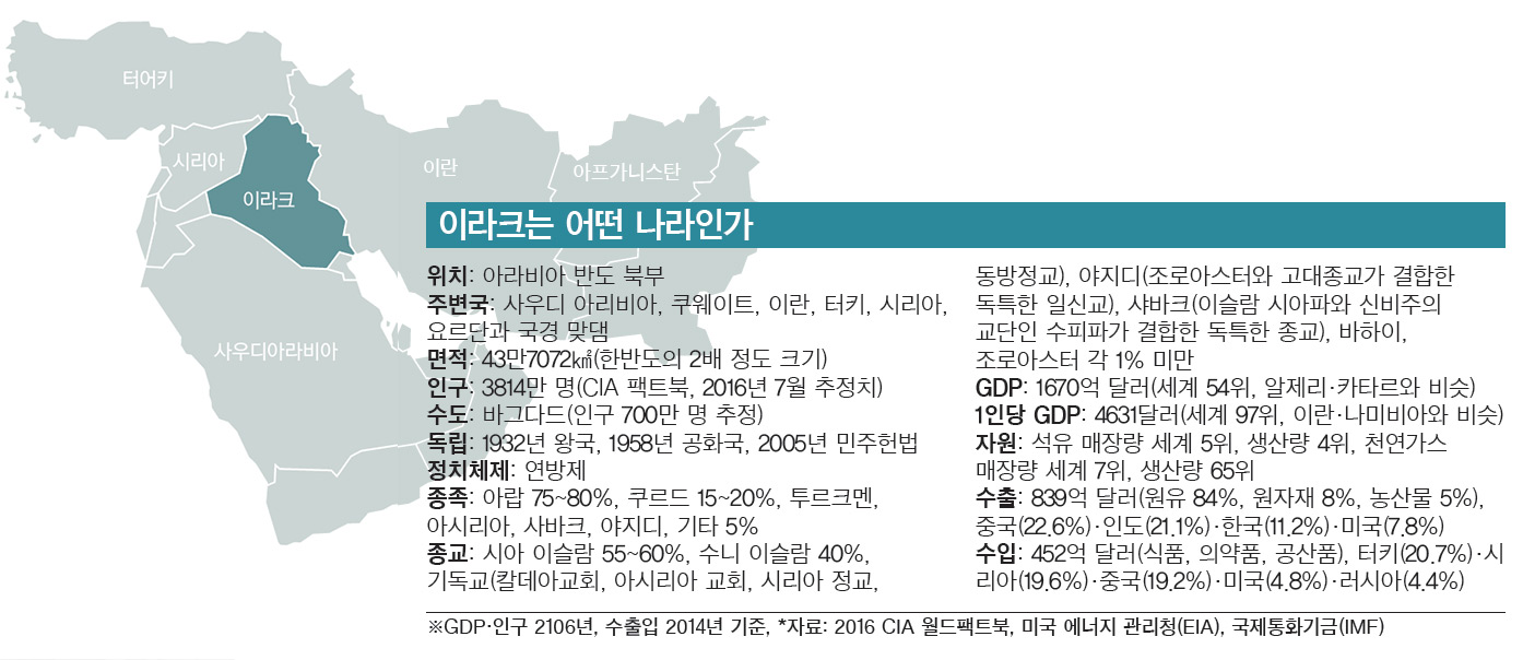 7월 9일(현지시간) IS 최대 거점도시였던 모술을 해방시켰다고 선언한 이라크 알아바디 총리의 트위터. / 사진 : 트위터 캡처이라크의 유전은 크게 북부 지역과 남부 지역, 그리고 동북부 쿠르디스탄(쿠르드족 거주지역)에 몰려 있다. 모술 지역의 원유 생산 시설이 복구되면 이라크의 원유 수출이 크게 늘 것으로 예상된다. 단순히 탈환된 유전의 복구로 인한 생산 증대를 넘어 이라크 북부지역 전체의 석유 생산이 증가할 수밖에 없기 때문이다. 모술 중심의 이라크 북부 지역 원유 생산과 채굴 작업은 2014년 6월 IS가 이 지역을 공격해 들어오면서 감소하기 시작했다. 이라크는 바스라를 중심으로 남부 지역의 원유 생산을 독려하면서 이를 벌충하려고 노력했다. 이라크 북동부의 쿠르드족 거주지역인 쿠르디스탄의 석유 관련 산업은 IS의 위협에도 큰 영향을 받지 않았다. 무능한 이라크 중앙정부의 군대 대신 자치 정부의 쿠르드족 민병대인 페슈메가르의 전투력이 뛰어났기 때문이다. 물론 준자치지역인 쿠르드지역 정부(KRG) 산하에 있는 몇몇 유전에서 가까운 곳에서 전투가 벌어지면서 생산이 일시 중지되기도 했다. 유전을 추가로 찾기 위한 시추 작업은 IS의 위협 가능성 때문에 그동안 중단돼왔다.