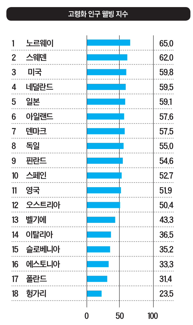 서던캘리포니아대학 섀퍼 보건정책·경제학 연구소의 대나 골드먼은 “이 지수는 각국이 고령화 문제에 얼마나 잘 적응하는지 그 실태를 정확히 보여준다”고 말했다. 조사 결과는 샌프란시스코에서 열린 국제노인학·노인병학협회 회의에서 발표됐다.
