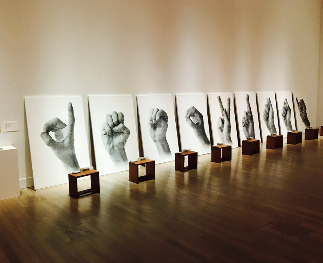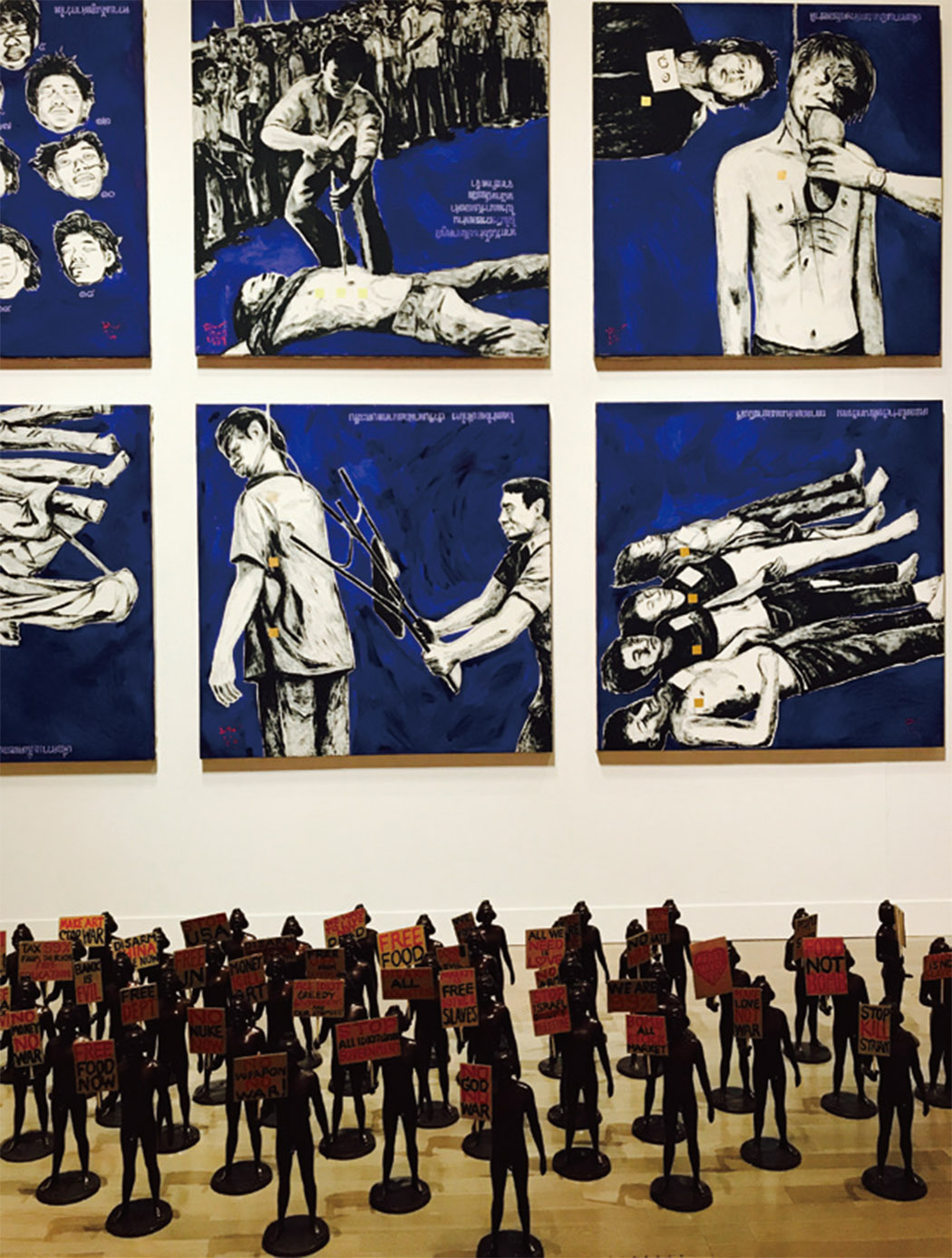 장미빛 안경을 통해, 2017 또한 전시 섹션들이 제시하듯, 역사적 사건들을 다루는 작품들이 많았는데, 그러한 작품들 중 와산 시티켓의 <파란 10월> (1996)은 매우 압도적인 설치로 다가온 작품이다. 1976년 방콕 타마삿대에서 일어난 학생운동을 배경으로 당시 상황을 재현하는 듯한 화면과 신문 보도내용이나 학생운동에서 사용된 노래의 가사 등을 한 화면에 담아 낸다. 당시 대학생이기도 한 그는 이 사건을 중심으로 사회파 작가로서 입지를 굳히고 활약하였다. 아래에는 플래카드를 든 자신의 미니어처를 늘어놓은 <잃어버린 정보> (2010)를 설치했다. 이 작품은 가끔 빈 플래카드에 관람자가 문구를 써 넣으며 운동에 참여할 수 있는 인터랙티브 형식으로 전시된다. 동남아의 중요한 작가들 또한 우리가 민중예술이라는 장르를 가지고 있듯, 정치·사회적 표현으로써 예술을 이용했다는 점을 발견할 수 있다. 이러한 작품들을 소개할 만한 미술관이나 화랑이 부재한 시대에서도 작가들이 중요한 액티비스트로서의 역할을 수행하며 미술계를 리드해갔다는 점이 이번 동남아시아 전시작품을 보면서 두드러지게 나타난다. 와산 시티켓, 파란 10월, 1996 / 와산 시티켓, 잃어버린 정보, 2010 예를 들어, FX 하루소노의 출품작인 <목소리 없는 목소리> (1993-1994) 작품은 9개의 패널에 수화로 표현한 데모크라시라는 글자를 보여준다. 마지막 글자를 만드는 손은 밧줄로 묶여 있는데, 이는 자유롭게 민주주의를 이야기 하는 것에 대한 어려움과 당시에 존재하던 언론적 사상적 자유에 대한 억압을 의미하기도 한다. 중화계 자바인인 FX 하루소노는 최근에는 중화계로서 살아가는 삶에 대한 억압과 차별에 대해 이야기한다. 매우 아름다운 드로잉으로, 보여주는 손짓이 무엇일지 궁금한 관객에게 이 내용이 수화로 만들어진 민주주의라는 단어를 알게 되는 순간은 매우 진한 감동을 주게 되는 동시에 작가의 예술적 승화라는 것이 이런 것일 수 있구나 라는 생각을 하게 한다.
