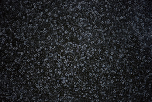 사진은 꽁꽁 언 겨울강에서 얼음을 찍은 것입니다. 공기와 물이 만나면 기포가 생깁니다. 얼음 속에 무수히 많은 기포가 있습니다. 얼음이 두껍게 얼면 기포의 위치가 서로 다릅니다. 이를 위에서 내려다 보면 기포와 카메라와의 초점 거리가 제각기 다릅니다. 얼음 중간 깊이에 있는 기포 하나에 초점을 맞추고 사진을 찍습니다. 조리개 수치를 각기 달리해 사진을 찍으면 공간적인 깊이감이 달라집니다. 조리개를 약간 열고 사진을 찍었습니다. 기포의 선명도가 서로 차이가 납니다. 원근감과 깊이감이 강조됩니다. 동그란 기포가 검고 먹먹한 우주 공간에 떠 있는 별처럼 보입니다.