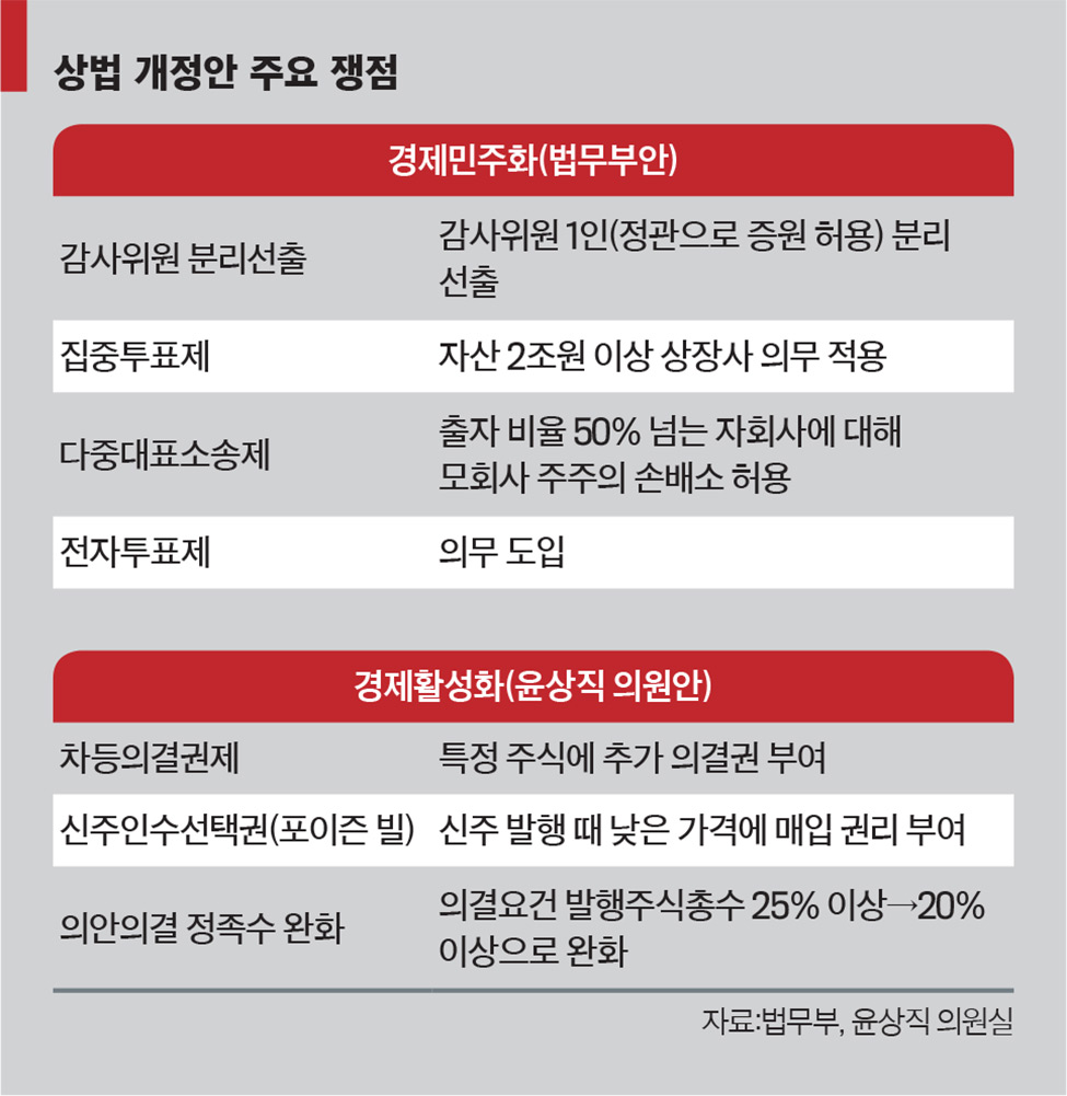 실제로 주식회사의 최고의사결정기구는 총수 등 오너 일가가 아니라 이사회다. 하지만 이사회가 사실상 총수의 뜻대로 구성돼 이사들은 거수기(擧手機)에 불과하다는 게 문제의 핵심이다. 총수의 전횡을 제대로 감시할 사람이 없다는 얘기다. 총수가 잘못을 해도 아무도 입을 열지 않는다. 그래서 정부와 여당은 총수 뜻에 반하는 의견을 낼 수 있는 사람이 이사회에 들어갈 수 있도록 제도를 바꿔보겠다는 것이다. 이게 최근 논란이 되고 있는 상법 개정안의 취지다. 이를 위해 정부와 여당은 ▶집중투표제 의무화 ▶감사위원 분리 선출 ▶다중 대표소송 도입 등을 추진하고 있다. 이는 대부분 대주주의 의결권을 제한하는 내용인데, 법무부도 올 4월 집중투표제 의무화 등을 긍정적으로 평가한 의견을 국회 법제사법위원회에 제출했다.