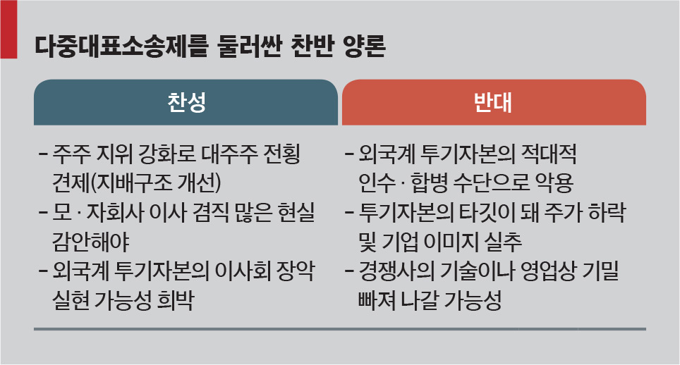 다중대표소송도 논란의 한 가운데 있다. 다중대표소송은 모(母)회사가 자(子)회사 지분을 30% 이상 보유하고, 모회사 주주가 모회사 지분을 0.01%(상장사 기준, 비상장사는 1%)만 갖고 있으면 소송이 가능하다. 심지어 모회사 1주만 있어도 되는 법안(노회찬 정의당 원내대표 발의)도 있다. 세계에서 유일하게 이 제도를 시행하고 있는 일본이 100% 모·자회사 간에만 허용되도록 엄격히 제한한 것과는 대조적이다. 이 안이 시행되면 예컨대 A그룹의 지주사인 ㈜A가 A전자 지분 34% 보유하고 있다. 그런데 미국의 행동주의 펀드인 엘리엇 매니지먼트(Elliot management·이하 엘리엇)가 ㈜A의 주식을 0.1% 갖고 있다고 치자. 이렇게 되면 엘리엇은 0.1%의 ㈜A 주식을 숙주 삼아 전혀 다른 법인격인 A전자 임원을 상대로 소송을 제기할 권한을 확보할 수 있다. A전자뿐만이 아니다. 엘리엇은 ㈜A가 지분 30% 이상을 갖고 있는 주요 계열사 전부를 같은 식으로 쥐고 흔들 수 있게 된다.