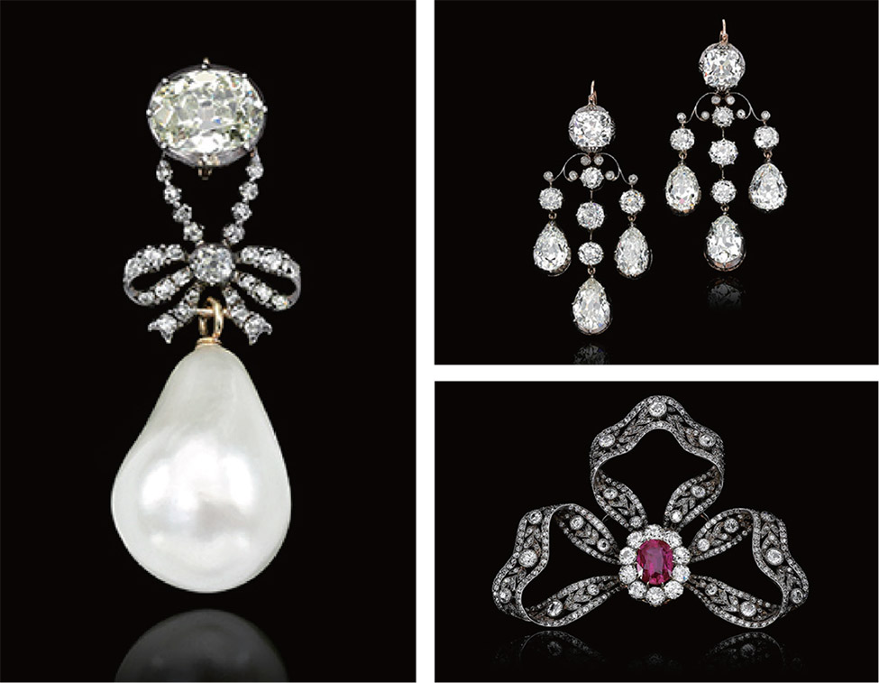 단두대에서 처형된 프랑스 왕가가 소유했던 귀걸이와 진주, 왕관 등 100여 개 품목 오는 11월 경매에 붙여져 (왼쪽부터 시곗바늘 방향으로) 마리앙투아네트의 진주와 다이아몬드 펜던트(낙찰 추정가 100만~200만 달러). 마리 테레즈의 다이아몬드 귀걸이(낙찰 추정가 15만~25만 달러). 루비와 다이아몬드 브로치(낙찰 추정가 20만~30만 달러). / 사진:SOTHEBYS.COM단두대에서 처형된 프랑스 왕가와 귀족 가문이 소유했던 다이아몬드와 진주 컬렉션이 오는 11월 스위스 제네바의 소더비 경매장에 모습을 드러낸다. 지금까지 대중에 공개된 적 없는 보석들이다.