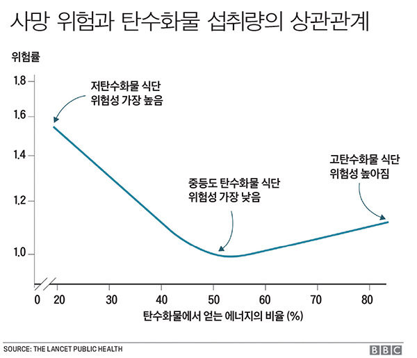 피험자는 연구를 시작할 때와 6년 후 두 차례에 걸쳐 어떤 음식과 음료를 먹고, 한 번에 얼마나 섭취하며, 또 얼마나 자주 먹는지 등 식단에 대한 전반적인 설문조사에 응했다. 연구팀은 피험자를 탄수화물 섭취가 적은 그룹(식단의 40% 미만), 많은 그룹(70% 이상), 적정한 그룹(50~55%)으로 나눠 평균 25년을 추적하면서 식단, 나이, 사망률 등의 요인을 확인했다. 추적조사 기간에 조사 대상자 중 6283명이 사망한 것으로 집계됐다. 통계 분석 결과 탄수화물을 과도하게 섭취했거나 지나치게 적게 섭취한 그룹에서 사망률이 약간 높게 나타났다. 전체 에너지량의 40% 이하를 탄수화물에서 얻은 과소섭취 그룹과 70% 이상을 탄수화물로 충당한 과다섭취 그룹의 경우 전체 에너지량의 50~55%를 탄수화물로 섭취한 그룹보다 사망률이 약간 더 높게 나타나는 U자형 상관관계를 보였다. 연구팀은 탄수화물 비율이 50~55%인 그룹에 속한 50세의 경우 평균 83세까지 생존하는 것으로 추정했다.