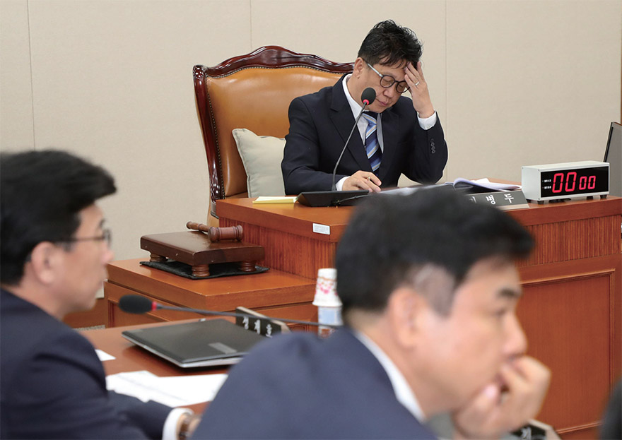 국감 기업인 증인 채택 해마다 늘어… “의원 본인 홍보와 여론몰이용” 비난 많아 정무위원회 전체회의에서 국정감사 증인 채택을 놓고 여야 간 의견이 나뉘며 의원들의 발언이 이어지자 민병두 정무위원장이 생각에 잠겨 있다.10월 12일부터 31일까지 20일 간 열릴 올해 국정감사(국감)에서 재계의 가장 큰 관심사는 기업인 증인 채택 여부다. 해마다 국감에서는 대기업 오너와 최고경영자(CEO)가 대거 증인과 참고인으로 채택된다. 올해에도 어느 기업 총수가 국감에 출석할지 관심이 쏠리고 있다. 총 17개 상임위원회에서 10월 5일 현재까지 증인·참고인 출석 요구가 확정된 곳은 정무위원회(정무위)·환경노동위원회(환노위)·산업통상자원중소벤처기업위원회(산자중기위)·과학기술정보방송통신위원회(과방위) 등이다.