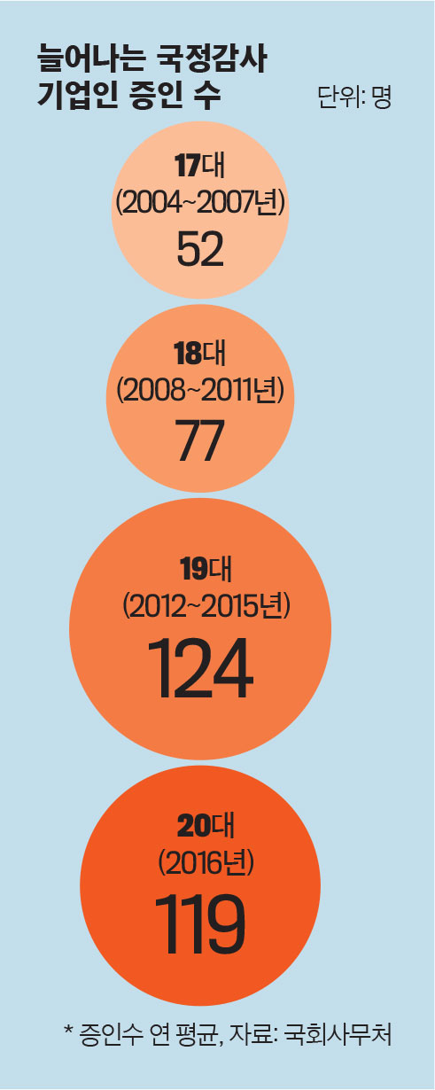 올해 국감에서도 많은 기업인이 증인·참고인으로 국감장에 얼굴을 보일 전망이다. 국감에서는 매년 기업인의 증인 채택이 늘고 있다. 지난 17대에는 연 평균 52명, 18대 77명, 19대 124명, 20대 119명 기업인이 국회 증인 명단에 이름을 올렸다. 이렇듯 매년 국감 때마다 국회의원들이 기업인들을 마구잡이로 호출한다는 비난을 받는다. 김민전 경희대 후마니타스 칼리지 교수는 “국회의원들은 기업인 증인 채택을 본인 홍보나 여론의 관심을 받으려는 목적으로 악용하고 있다”고 지적했다.