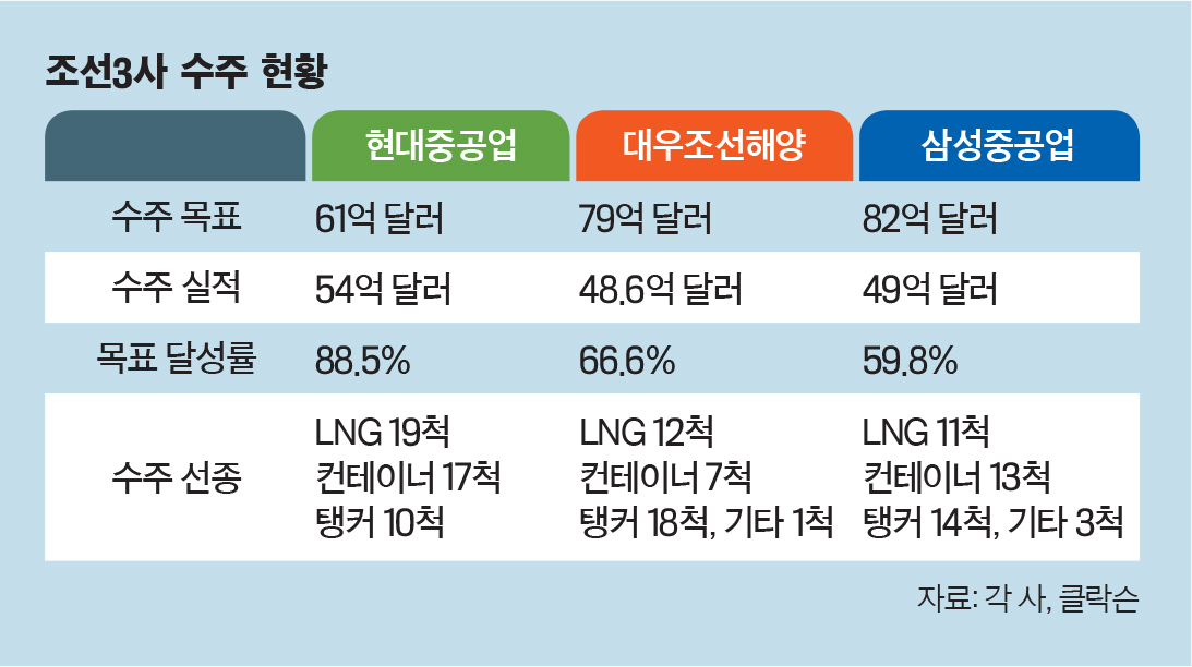 조선해운시황 분석기관 클락슨리서치에 따르면 국내 조선사들은 올 1~10월 224척, 1026만CGT(표준화물선환산톤수)를 수주해 중국(710만CGT)을 큰 폭으로 앞설 것으로 보인다. 한국 조선업이 중국을 제친 것은 2012년 이후 7년 만이다. 중소형 조선사는 여전히 수주 가뭄에 시달리고 있고, 발주량과 선가가 아직 제자리를 찾지 못해 조선업 전체가 회복됐다고 단정하기는 어렵다. 그러나 내년에도 한국 조선사가 강한 액화천연가스(LNG)선과 대형 컨테이너선을 중심으로 발주가 늘어날 전망이라 당분간 먹거리 걱정은 하지 않아도 될 것으로 기대된다.