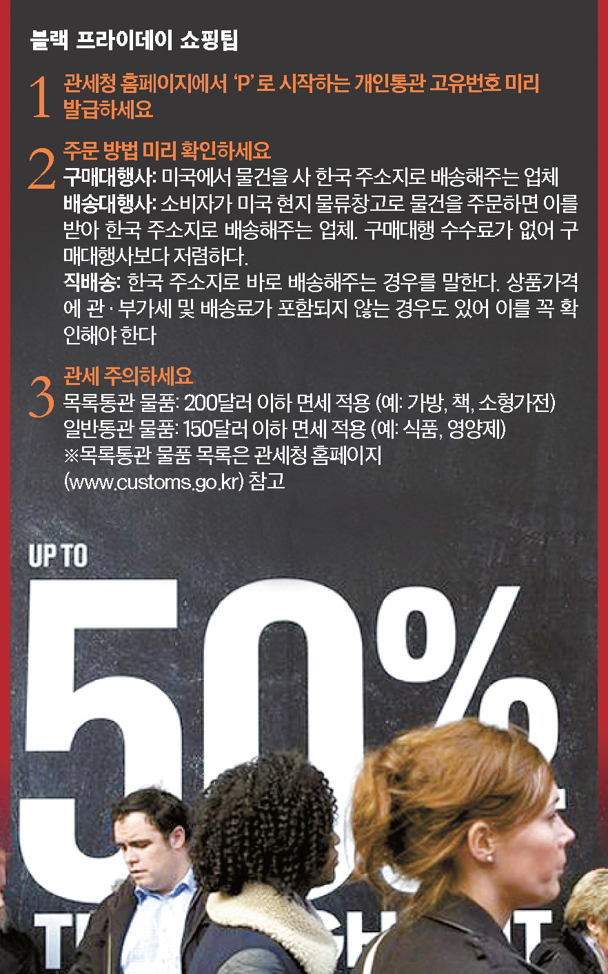 아마존·베스트바이·코스트코, 1+1 행사, 기프트카드 증정 ... 관세청에서 개인 통관 고유번호 등 미리 받아야 큰 장이 선다. 블랙프라이데이 얘기다. 올해 미국의 추수감사절은 11월 22일인데, 블랙프라이데이는 다음날인 23일 밤에 시작한다. 한국 시간으로는 토요일인 24일 오후 2시부터다. 처음 시작된 1960년대에는 하루짜리 행사였지만, 온라인 쇼핑몰이 진화하며 판이 커졌다. 블랙프라이데이 일주일 전부터 유통 기업들이 다양한 할인행사를 하며 분위기를 돋운다.블랙프라이데이 주말 직후엔 온라인 쇼핑몰 중심의 더 큰 할인이 펼쳐지는 ‘사이버먼데이’ 이벤트가 있다. 주말에 팔고 남은 제품을 처리하는 행사라 할인폭이 블랙프라이데이보다 오히려 크다. 그 이후에도 다양한 할인 행사가 열린다, 크리스마스와 연말로 이어지는 랠리데이로 이어진다. 한 달 넘게 파격 할인이 계속되는 세계 최대 규모의 쇼핑 시즌인 것이다.