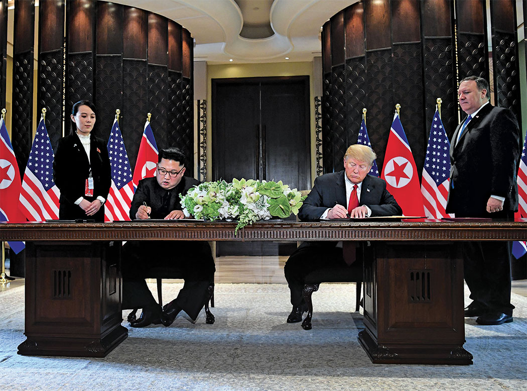 트럼프 대통령은 2018년 6월 김정은 북한 국무위원장과 싱가포르 정상회담 합의문에 서명한 후 북핵 위기가 “대부분 해결됐다”고 성급하게 선언했다. / 사진:NEWSIS반면 미국 정부는 핵프로그램을 기꺼이 자발적으로 포기한 국가들의 역사적인 사례를 지적한다. 민주화 후의 남아공과 소련 해체 후의 우크라이나가 그 예다. 북한도 그렇게 하면 투자가 흘러들어가기 시작할 것이라고 미국은 말한다.