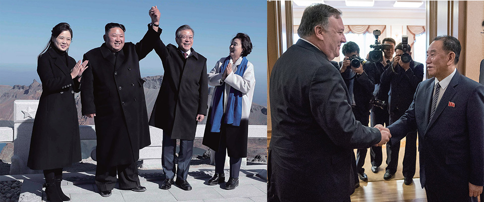 문재인 대통령은 2018년 9월 북한을 방문했고 김정은 국무위원장도 조만간 답방을 약속했지만 아직 이뤄지지 않았다. 사진은 2018년 9월 백두산 천지에 오른 두 정상 내외(왼쪽 사진). 마이크 폼페이오 미국 국무장관은 2018년 7월 김영철 북한 노동당 부위원장과 고위급회담을 가졌다. / 사진:NEWSIS그렇다면 미국이 한국에 비밀 핵무기를 숨겨뒀다고 김정은 위원장도 실제로 믿는다는 뜻일까? 외교관들은 그 점은 분명치 않다고 말한다. 그러나 한 미국 관리는 김 위원장의 군사 보좌관들 중 일부가 그렇게 확신할 가능성이 ‘매우 크다’고 덧붙였다. 바로 그것이 문제다.