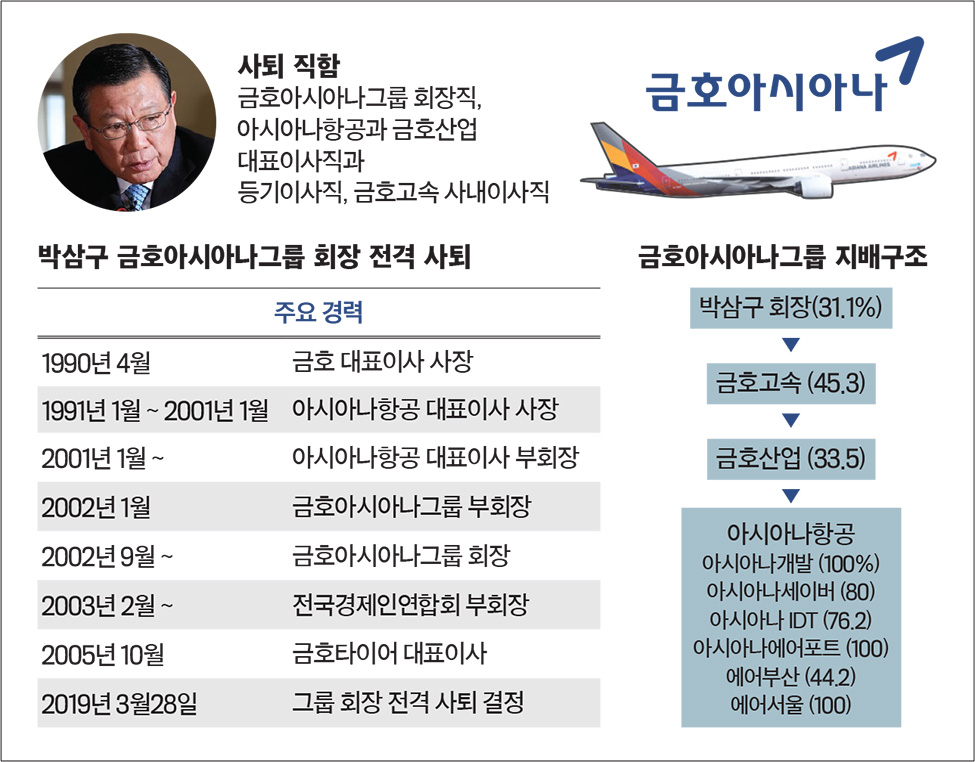 이번 ‘회계쇼크’ 사태의 최대 관심사는 아시아나항공이었다. 박삼구 금호아시아나그룹 회장의 전격 퇴진으로까지 불똥이 튀었기 때문이다. 주총을 하루 앞둔 3월 28일 그룹 회장직과 아시아나항공·금호산업의 대표이사직과 등기이사직을 내려놓기로 결정했다. 3월 21일 아시아나항공에 대한 삼일회계법인의 ‘한정’ 의견 감사보고서 제출이 기폭제였다. 아시아나항공은 3월 22일 주식 거래가 정지됐고, 25일 관리 종목으로 지정됐다. 26일 감사 의견을 ‘적정’으로 정정한 감사보고서를 한국거래소에 제출하면서 한숨 돌리는 듯했지만 거기까지였다. 감사의견 ‘한정’ 여파로 아시아나항공의 부실이 추가로 드러났기 때문이다. 수정한 최종 감사 보고서에 따르면 부채(연결기준)는 수정 전보다 1400억원 정도 늘었고, 부채 비율은 625%에서 649%로 증가했다. 영구채 발행과 같은 재무개선 작업도 타격을 받으면서 금호아시아나그룹 전체로 ‘한정 파문’이 확산됐다. 유동성 문제에 시달리는 아시아나항공이 채무 불이행 사태에 빠지면 그룹이 흔들리는 상황에 빠지기 때문에 박 회장은 사퇴라는 강수로 산업은행의 지원을 끌어내려고 했다는 분석이다. 또 조양호 한진그룹 회장이 3월 27일 대한항공 주주총회에서 주주들의 의결권 행사로 사내이사직에서 쫓겨난 것과 같은 ‘불명예 퇴진’을 막기 위한 포석으로도 풀이된다. 박 회장은 1967년 금호타이어에 입사해 2002년 그룹 회장에 오른 이후 18년 만에 자리에서 내려온다.