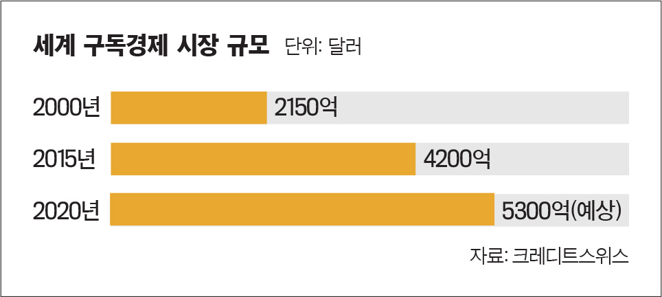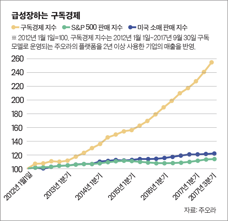 구독은 책이나 신문을 사서 읽는다는 의미의 단어다. 하지만 최근에는 이씨처럼 월정액을 내고 정기적으로 특정 상품(혹은 서비스)을 사용하는 행위 전체를 뜻하는 단어로 외연을 넓히고 있다. 산업 현장에서는 이를 ‘구독경제(subscription economy)’라고 부르기도 한다. 구독 자체는 전통적인 산업으로 이미 수십 년 전부터 우리 생활에 녹아 있었지만, 여기에 정보통신기술의 발전과 스마트 기기의 확산 등 새로운 산업이 접목하면서 구독경제가 새로운 트렌드로 부상하고 있다. 구독경제라는 용어를 만든 기업 주오라(Zuora)에 따르면 구독기반 산업의 매출은 스탠다드앤드푸어스500(S&P500) 기업 매출보다 약 8배, 미국 소매업계 매출보다 약 5배 빠르게 성장하고 있다. 소비자는 좀 더 저렴하게 상품이나 서비스를 소비하고, 기업은 구독자를 통해 지속해서 수익을 낸다. 제품 자체보다는 제품이 주는 효용성을 중시하는 소비 트렌드가 더욱 굳어지면서 나타나는 현상이다. 주오라의 창업자 티엔 추오(TienTzuo)는 “유행처럼 번졌던 공유경제를 넘어 이제는 구독경제로 향하고 있다”며 “구독경제는 사업 모델을 제품 중심에서 고객 중심으로 전환한 것”이라고 정의한다.
