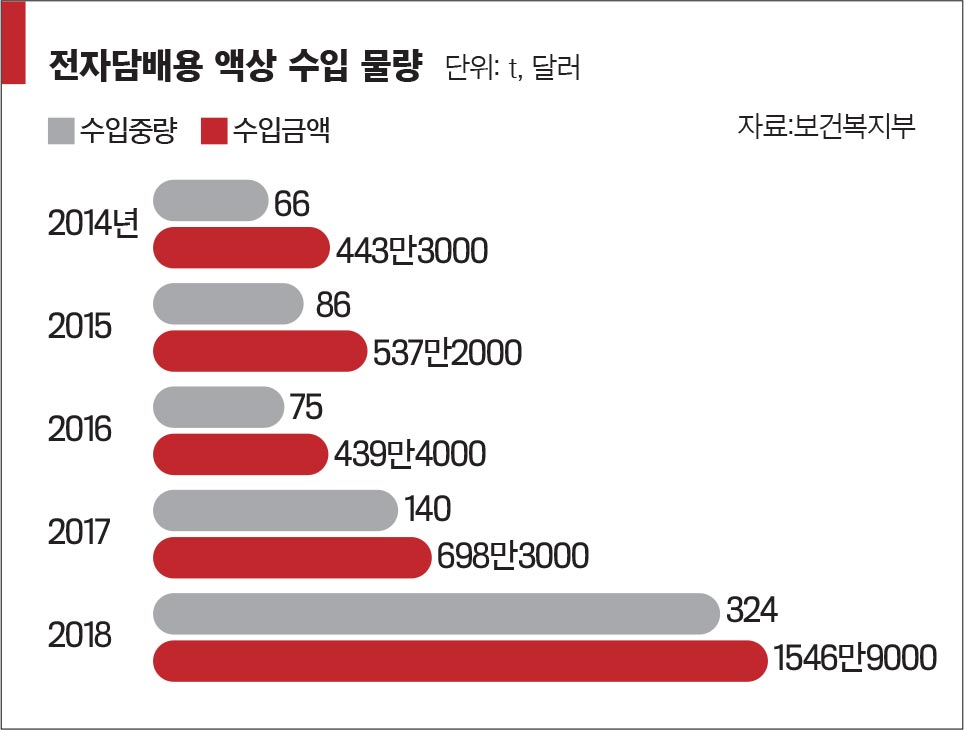 2015년 정부의 담뱃값 인상 전후로 액상형 전자담배는 선풍적인 인기를 끌었다. 일반담배에 비해 비용이 적게 드는 데다 담배 특유의 역한 냄새가 없고, 수박·망고 등 다양한 맛을 즐길 수 있어 20~30대를 중심으로 빠르게 확산했다. 인천공항 세관에 따르면 2013년 798건에 그쳤던 전자담배 기기 수입 물량은 이듬해 1만2967건으로 급증했다. 하지만 인기가 오래 가진 않았다. 하루에도 몇 번씩 액상을 보충해야 했고, 액상이 줄줄 새 주머니가 젖는 등 편의성이 떨어졌기 때문이다. 가장 큰 문제는 안전이었다. 중국산 저가 액상형 전자담배 기기가 충전 중 폭발하는 사고가 연이어 발생했다. 뒤이어 기화기의 핵심 부품으로 용액을 가열하는 ‘코일’이 인체에 유해한 유리섬유로 만들어진 사실이 알려지면서 뜨거웠던 열기는 급격히 식었다.