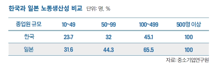 종업원 50인 이하인 국내 중소기업의 노동생산성(노동자 1인당 매출액)이 500인 이상 종업원을 둔 대기업 노동생산성의 23.7%에 불과하다는 분석 결과가 나왔다. 노민선 중소기업연구원 연구위원은 8월 20일 서울 여의도 중소기업중앙회에서 열린 ‘중소기업 노동생산성 향상 정책토론회’에서 이 같은 분석 결과를 발표했다. 노 연구위원 발표 자료에 따르면, 2016년 기준 종업원 500명 이상 대기업의 노동생산성을 100이라고 할 때 종업원 10~49명인 국내 중소기업의 노동생산성은 23.7%에 불과했다. 종업원 50~99명인 중소기업은 32%, 100~499명인 중소기업은 45.1%였다. 반면 일본의 경우 종업원 500명 이상 대기업과 비교해 종업원 10~49명인 중소기업의 노동생산성은 31.6%로 한국(23.7%)보다 7.9%포인트 높았다. 종업원 50~99명(44.3%)과 100~499명(65.5%)인 중소기업의 노동생산성을 한국과 비교해도 각각 12.3%포인트, 20.4%포인트 높았다. 대기업과 중소기업 간 노동생산성 격차도 한국이 일본보다 더 컸다. 종업원 500명 이상 대기업과 10~49명인 중소기업의 노동생산성 격차를 보면 한국은 76.3%포인트였고, 일본은 68.4%포인트였다. 한국의 대-중소기업 간 생산성 격차의 주 원인으로는 대기업과의 하도급거래가 지목됐다. 노민선 연구위원은 “국내 중소기업 중 하도급거래를 하는 비중은 45%(2018년 기준)에 달하고, 이들 하도급 참여 중소기업은 매출의 80%를 대기업에 의존하고 있다”고 말했다. 짧은 근속기간과 핵심 인력 이직도 문제다. 그는 “한국 중소기업의 근속기간은 규모별로 4년 4개월~7년 7개월로 대기업(10년 3개월)이나 다른 경제협력개발기구(OECD) 회원국에 비해 짧고, 핵심 인력의 잦은 이직으로 큰 피해를 겪고 있다”고 말했다. 국내 중소기업의 열악한 연구개발(R&D) 현실도 지적했다. 부가가치가 높은 제품을 개발하기 위해선 R&D가 필수인데, 자금과 인력이 부족하다는 것이다. 노 연구위원은 “중소기업 1곳당 평균 R&D 투자금액은 2007년 6억3000만원에서 2017년 3억4000만원으로 감소했고, 평균 연구원 수는 8.3명에서 4.3명으로 줄었다”고 했다. 2017년 국내 대기업의 평균 R&D 투자금액은 259억원이고 평균 연구원 수는 90명이다.