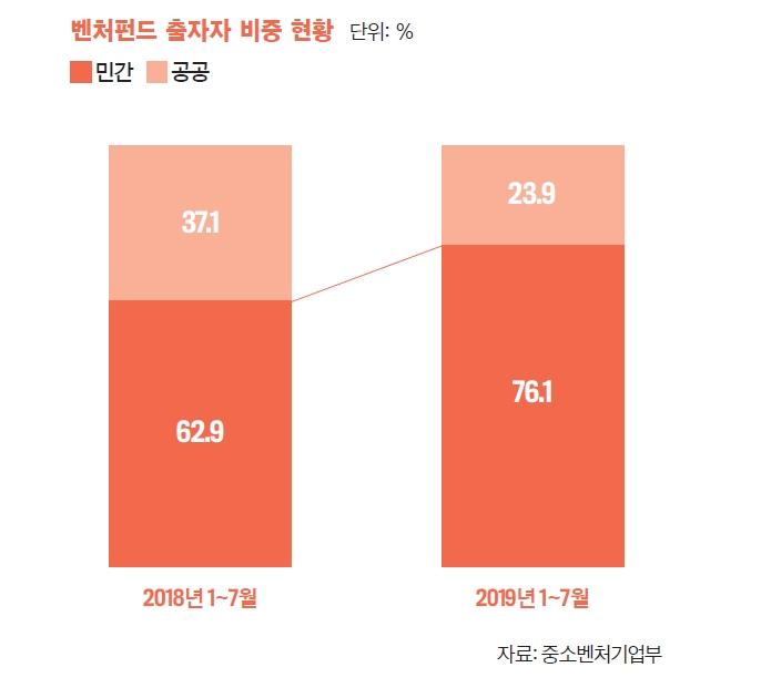 중소벤처기업부에 따르면 올해 1~7월 신규 벤처투자가 2조3739억원, 벤처펀드 결성액은 2조556억원으로 모두 역대 최고치를 경신한 것으로 나타났다. 이는 지난해와 비교해 신규 벤처투자가 23.7% 급증한 것으로, 중기부 올해 전체 벤처투자 목표치인 4조원 달성이 무난할 것으로 전망된다. 1~7월 벤처펀드 출자자를 살펴보면 민간 출자액이 1조5644억원으로 전체 2조556억원의 76.1%를 차지했다. 모태펀드와 성장금융, KDB산업은행 등 공공정책기관이 출자한 4912억원의 3배를 웃도는 수준이다. 또 지난해 같은 기간 민간의 출자액 비중이 62.9%를 차지했던 것과 비교해도 비중이 대폭 증가했다. 개인의 벤처펀드 출자 비중도 커졌다. 1~7월까지 개인이 벤처펀드에 출자한 금액은 1519억원으로 지난해 1년간 기록한 1306억원을 이미 넘어섰다. 전체 펀드 결성액의 7.4%를 차지하며 지난해 연간(2.7%)보다 4.7%포인트 증가했다. 중소벤처기업부 관계자는 “개인이 벤처펀드에 직접 출자하는 것 뿐만 아니라 벤처 투자신탁이나 사모재간접 공모펀드에 가입해 벤처펀드에 출자할 수 있는 등 방법도 다양해지고 있어 앞으로 개인의 벤처투자는 더욱 확대될 것으로 기대된다”고 말했다.