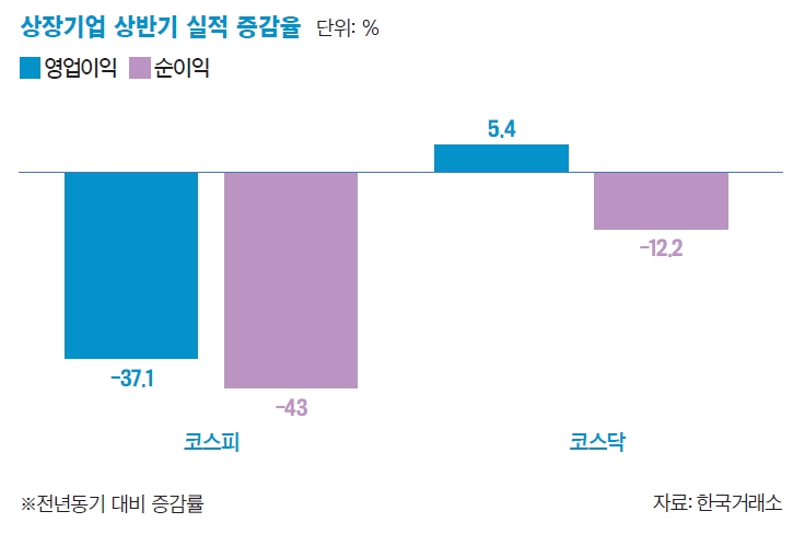 반도체 등 수출 기업 실적이 감소하면서 올 상반기 국내 상장사 영업이익이 1년 새 37% 급감했다. 한국거래소와 한국상장회사협의회가 12월 결산 코스피 상장사 574곳(금융업 제외)의 연결재무제표를 분석한 결과에 따르면 상반기 매출액은 988조24억원으로 전년 같은 기간보다 0.8% 늘었다. 하지만 영업이익과 순이익은 각각 55조581억원, 37조4879억원으로 37.1%, 43.0% 줄었다. 영업이익과 순이익 감소율은 2011년 상반기 상장사들이 연결재무제표를 작성한 이래 각각 최대폭이다. 2분기만 놓고 보면 실적 부진 추세는 더 뚜렷했다. 2분기 매출액은 503조9955억원으로 전년 같은 기간보다 1.5% 증가했지만 영업이익은 27조1706억원으로 37.4% 줄었고, 순이익도 16조5809억원으로 47.6% 감소했다. 이 같은 실적 부진은 미·중 무역분쟁 격화로 세계 무역이 위축되면서 수출 의존도가 높은 국내 기업에 악영향이 컸던 것으로 분석된다. 반도체 경기 악화에 코스피 시가총액 1·2위인 삼성전자와 SK하이닉스의 2분기 영업이익이 각각 55.63%, 88.56% 급감하는 실적 악화를 보였다. 수출 의존도가 높은 대기업 수익성도 악화됐다. 2분기 기준 대기업 198곳의 매출액 대비 영업이익률은 평균 5.5%에 그쳤다. 영업이익률이 5%는 기업이 1000원어치를 팔아 50원을 남겼다는 뜻이다. 반면 코스닥 상장사들은 코스피에 비해 상대적으로 양호한 성적을 거뒀다. 상반기에 매출액과 영업이익이 증가했으나 순이익은 감소했다. 코스닥 사장사 12월 결산법인 909곳의 연결기준 매출액은 89조5442억원으로 작년 상반기보다 9.06% 증가했고 영업이익은 4조7731억원으로 5.43% 늘었다. 그러나 순이익은 3조1791억원으로 12.18% 줄었다. 분석 대상 909곳 중 흑자 기업은 585곳(64.36%)이었고 적자 기업은 324곳(35.64%)이었다.