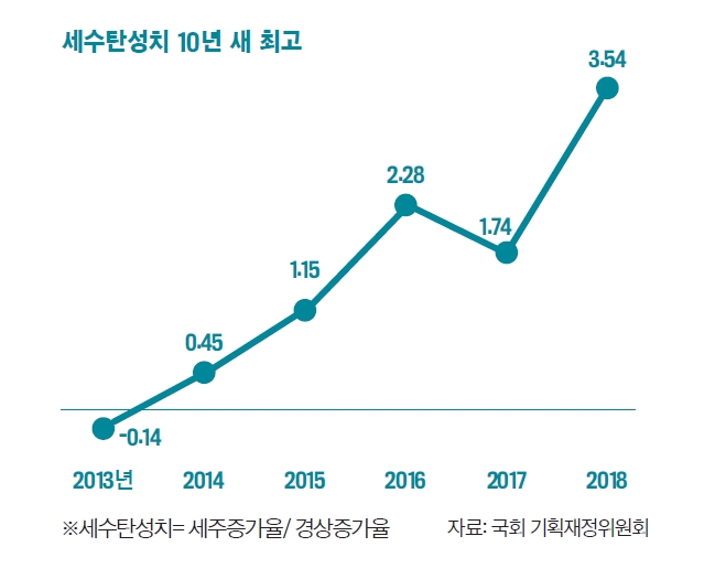 지난해 세수가 전년 대비 28조원 이상 더 걷히는 세수 호황을 기록했다. 세수탄성치는 최근 10년 사이에 가장 높은 수준을 나타냈다. 국회 기획재정위원회의 ‘2018회계연도 결산 검토보고서’에 따르면 지난해 국세 수입은 293조6000억원으로 전년 대비 10.6% 늘어났다. 지난해 경상성장률(실질성장률 + GDP디플레이터) 3.0%와 비교하면 세수탄성치는 3.54다. 세수탄성치란 세수 증가율을 경상성장률로 나눈 수치다. 세수탄성치가 1이면 경제가 성장한 만큼 세수가 늘었다는 뜻이고 1보다 높으면 경제가 성장하는 이상으로 세수가 더 걷혔다는 뜻이다. 세수탄성치는 글로벌 금융위기 직후인 2009년 마이너스(-0.39)를 기록한 후 2010년 0.81, 2011년 1.55. 2012년 1.65로 높아지다가 2013년 다시 마이너스(-0.14)를 기록했다. 이후 2014년 0.45, 2015년 1.15를 거쳐 세수 호황 기조로 2016년에는 2.28로 높아졌고 2017년에는 1.74로 조금 줄었다. 지난해 세수탄성치가 급등한 이유는 국세 수입이 전년 대비 28조2000억원이 더 걷혔기 때문이다. 정부는 법인 실적 개선, 부동산 시장 호조 등의 요인으로 세수가 늘었다고 설명했다. 국회예산정책처에 따르면 1980∼1990년대 국세 수입 증가율은 대체로 경상성장률과 유사한 추이를 보였다. 하지만 2000년대 이후 경상성장률에 대한 국세수입 증가율의 변동폭이 커지는 현상이 나타나고 있다.