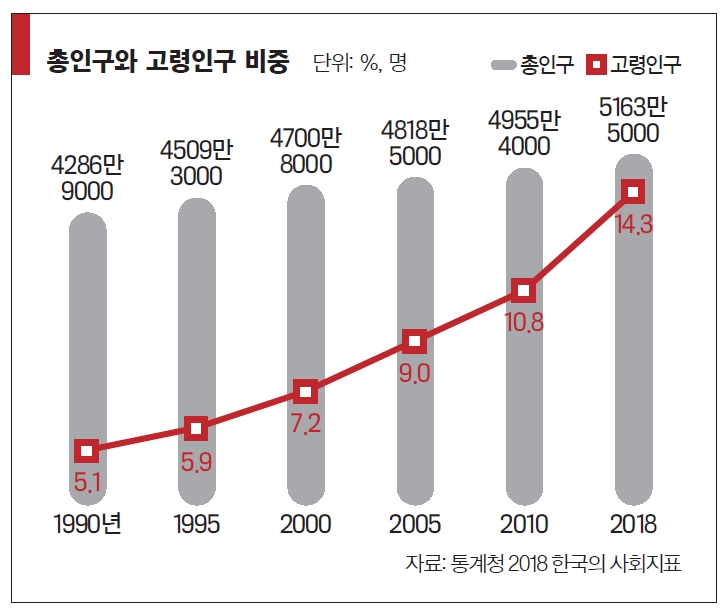 고령화 추세가 더욱 빨라지면서 고령 1인 가구 수도 더 늘어날 것으로 보인다. 지난해 한국 총인구 중 65세 이상 고령인구 비중은 처음으로 14%를 넘어서며 한국은 ‘고령사회’에 진입했다. 총인구 중 65세 이상 고령인구 비중이 7%를 넘어서면 고령화사회, 14%를 넘어서면 고령사회, 20% 이상은 초고령사회다. 통계청의 ‘2018 한국의 사회지표’에 따르면 지난해 우리나라 총인구는 5163만5000명으로 전년 5144만6000명보다 18만9000명(0.37%) 증가했다. 전체 인구를 일렬로 세워놨을 때 한가운데 위치하는 중위연령은 42.6세로 2010년 37.9세보다 무려 4.7세가 많아졌다. 특히 65세 이상 고령인구가 738만명으로 14.3%를 차지했다. 노인 인구가 늘면서 생산가능인구 100명이 부담해야 할 65세 이상 인구도 계속 증가하면서 경제에 부담을 주고 있다. 지난해 노년부양비율은 19.6명으로 2010년보다 4.8명 증가했다. 0~14세 유소년인구 100명당 고령인구 비중을 나타내는 노령화지수도 110.5명을 기록했다.