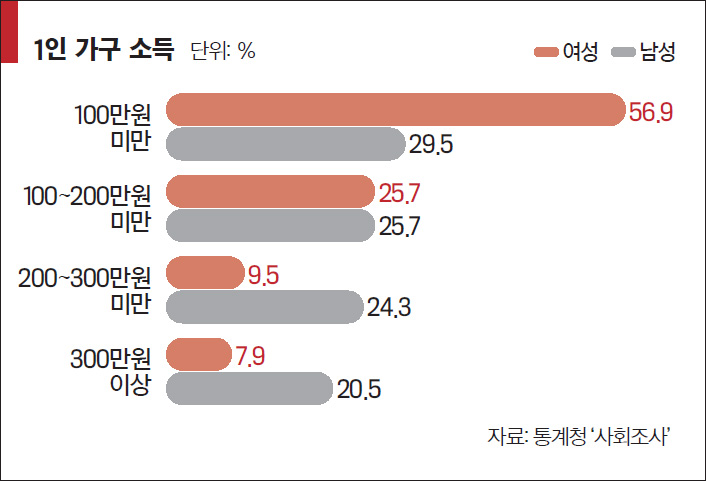 혼자서 죽음을 맞는 고독사도 이 연령층이 가장 높다. 국회 법제사법위원회 자유한국당 간사인 김도읍 의원이 지난 5월 보건복지부로부터 제출받은 자료에 따르면 최근 5년(2014~2018년)간 무연고 사망자는 8173명에 달했다. 무연고 사망자는 2014년 1379명, 2015년 1676명, 2016년 1820명, 2017년 2008명, 2018년 상반기까지 1290명으로 계속 늘어나 있다. 연령별로 보면 70세 이상이 2473명으로 전체 28.4%, 60~64세가 1222명(14.0%), 65~69세가 842명(9.7%), 50대가 1968명(22.6%), 40대 834명(9.6%), 40세 미만 292명(3.4%), 신원 미상 542명(6.2%) 등이다. 50대 무연고 사망자 비율은 22.6%로 70대에 이어 두 번째로 높았다. 이는 소득과 연관돼 있다. 가족이라는 울타리가 받쳐주지 않는 중장년층 1인 가구는 퇴직 연령이 빨라지고, 노후자금 저축 수준도 낮은 한국에서 사실상 가장 취약한 층이다.