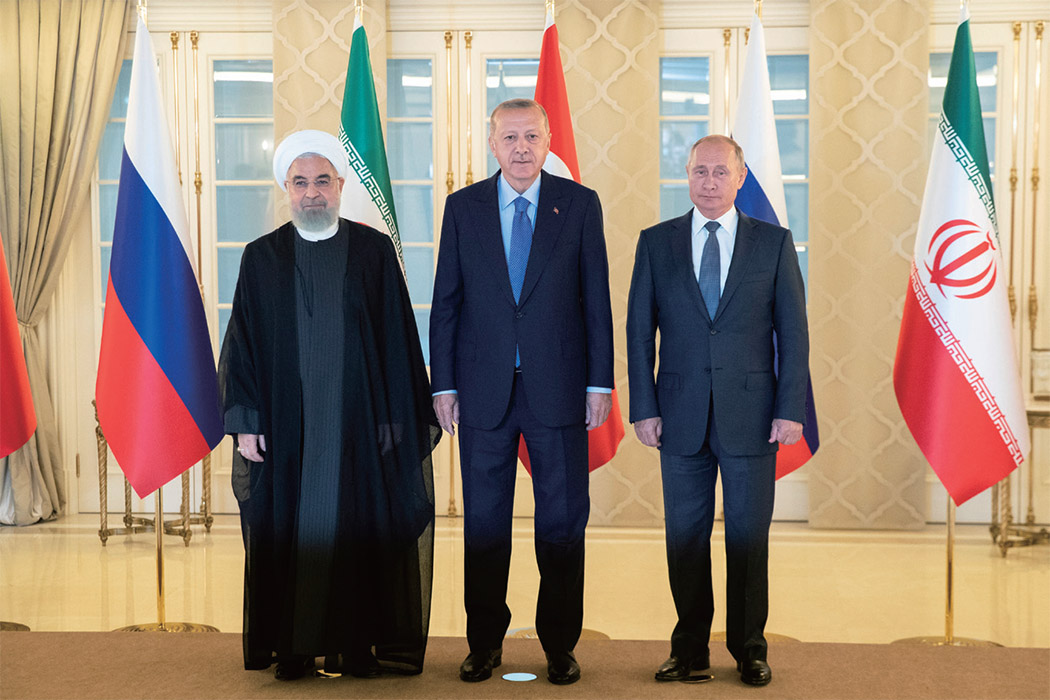 지난 9월 터키 앙카라에서 시리아 문제를 논의하는 회담을 가진 로하니 이란 대통령, 에르도안 터키 대통령, 푸틴 러시아 대통령(왼쪽부터). / 사진:AP/YONHAP러시아가 2015년 가을 시리아 내전에 개입한 것은 여러 가지 이유에서 전략적이었다. 우선 러시아는 급진 이슬람주의 단체를 주축으로 하는 반군에 밀리는 바샤르 알아사드 시리아 대통령 정부와 이란의 도움으로 동원된 민병대를 적시에 지원할 수 있었다. 또 그때는 미국이 이슬람주의 단체를 주축으로 하는 반군에 대한 지원을 보류하고, 이슬람국가(IS)와 싸우기 위해 쿠르드 인민수비대(YPG)가 주축인 시리아민주군과 손잡기 시작한 시점이었다.