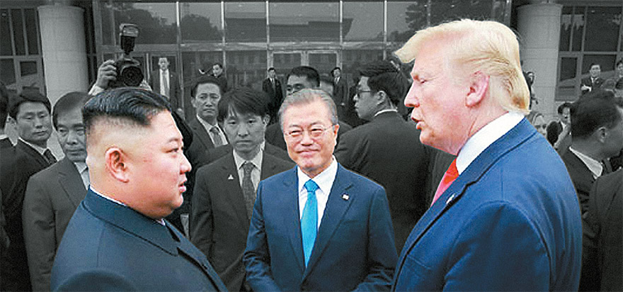 김정은의 ‘연말 시한’에 쫓기는 북 대미라인… 북미 모두 파국보다 상황 반전 모색할 듯 지난 6월 30일 김정은 북한 국무위원장이 판문점 남측 지역에서 문재인 대통령, 도널드 트럼프 미국 대통령과 만났다.북한과 미국이 3차 정상회담을 위한 실무협상 재개를 위해 날카로운 장외 신경전을 펼치고 있다. 평양과 워싱턴에서 하루가 멀다고 상대 측의 결단을 촉구하는 메시지를 쏟아내고 있다. 각기 그린 그림이나 향후 일정표를 넌지시 내비치기도 한다. 서로 ‘시간은 우리 편’이라며 협상 재개의 문턱을 낮출 것을 요구하고 있는 모습도 연출된다. 그러면서도 혹여 판이 깨질까봐 상황 관리에 만전을 기하는 신중한 분위기도 드러나고 있다. 지난 10월 초 스톡홀름 실무협상이 성과 없이 끝난 이후 양측이 향후 협상이나 정상회담에 대해 극도로 조심스런 태도를 취하고 있음을 알 수 있게 하는 대목이다.